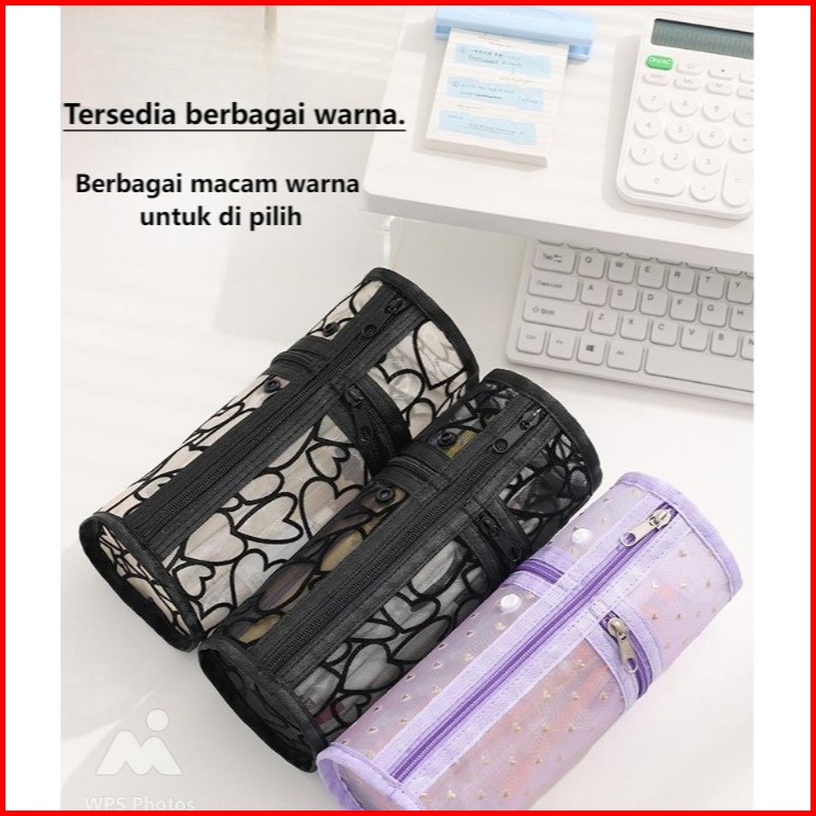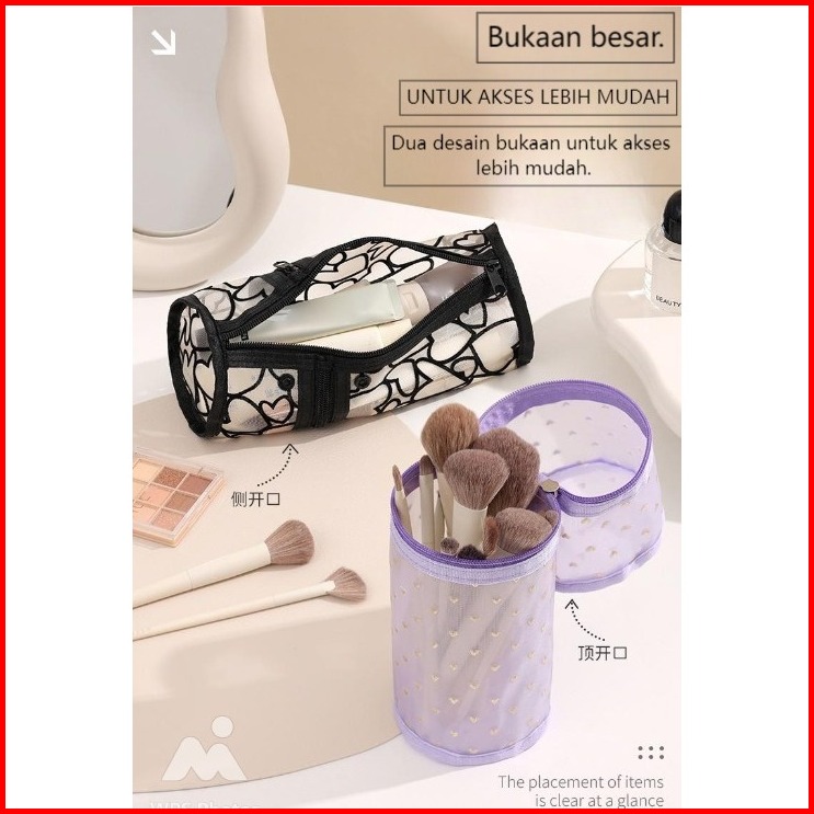 Beenlove Tempat Makeup Travel Transparan Jaring Mesh Model Tabung Transparan Elegan Dengan Motif Hati