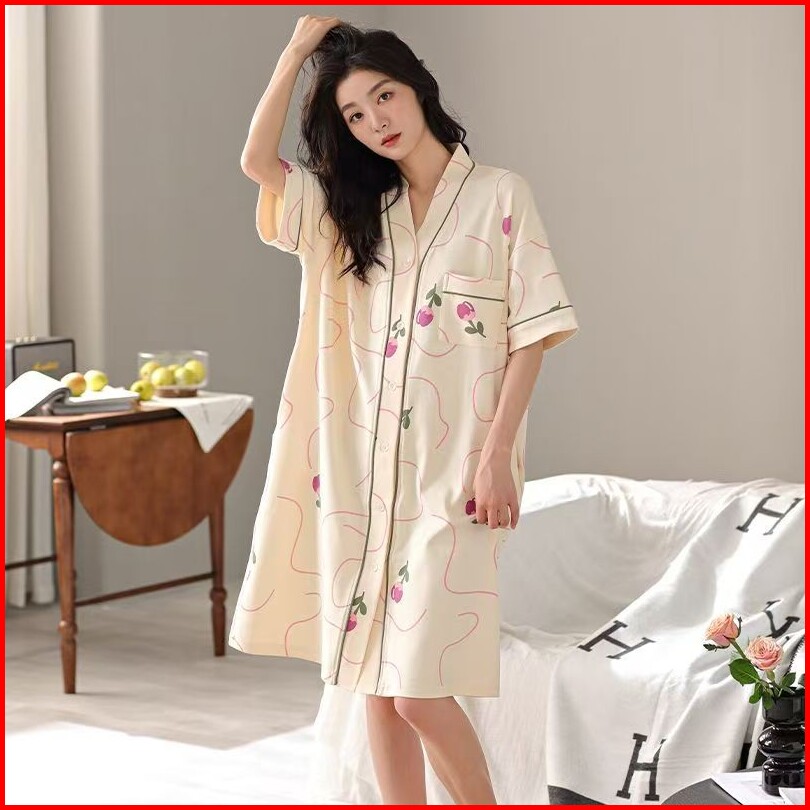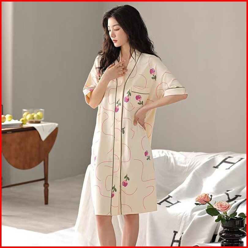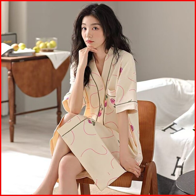 2025 Sleebee Gaun Tidur Wanita Warna Putih Kuning Lembut Berseni Motif Buah Strawberry Imut.piyama Wanita Gaun Tidur Str