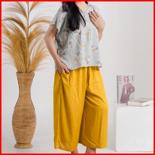 Rar.co - Kinan Blue Oneset Kekinian Setelan Rayon Susun Celana Kulot Lengan Pendek Jumbo Ademnyaman