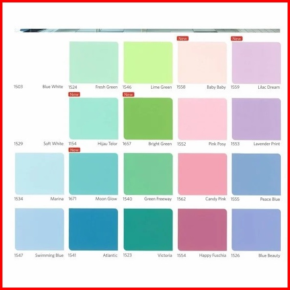 1501 EXTRA WHITE, TULIP-SUPER-WHITE, 1503 BLUE WHITE, 1505 WHITE, 1509 LILY WHITE, 1514 DURIAN, 1515 BARLEY WHITE, 1518 CREAM, 1519 BLACK, 1523 VICTORIA, 1525 JASMINE, 1526 BLUE BEAUTY, 1531 GOBY SANDS, 1534 MARINA, 1539 LAKESTONE, 1540 GREEN FREEWAY, 1541 ATLANTIC, 1546 LIME GREEN, 1547 SWIMMING BLUE, 1548 STONE GREY, 1549 COPPER GREY, 1550 GRAY CLOTH, 1552 PINK ROSSY, 1553 LAVENDER PRINT, 1554 HAPPY FUSCHIA, 1555 PEACE BLUE, 1556 CAFE LATTE, 1557 SUNSHINE, 1561 CHIFFON, 1562 CANDY PINK, 1117 IVORY, 1131 ORANGE TORCH, 1657 BRIGHT GREEN, 1671 MOON GLOW, 1154 HIJAU TELOR, 1185 HIBISCUS, 1691 GOLDEN HONEY, 1690 CLEAR SKY, 1533 SKY BLUE, 1681D SPRING VIGOR, 1688 REAL MORADO