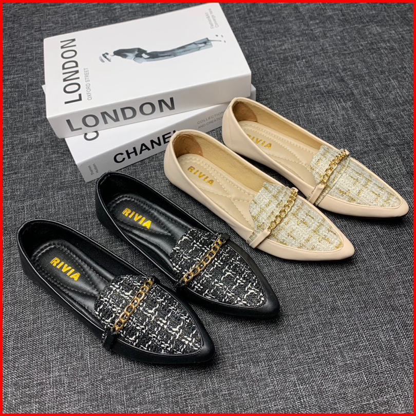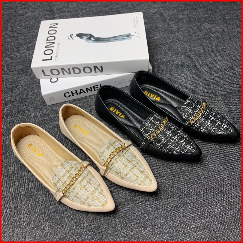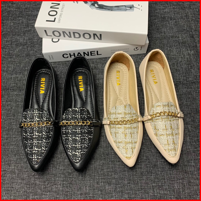 Sepatu Flat Shoes Wanita Motif Kain Rantai Tweed Trendy Sepatu Flatshoes Casual Cewek