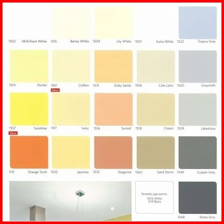 ARIES KAMBING SW, 1185 HIBISCUS, 1688 REAL MORADO, 1690 CLEAR SKY, 4 WARNA KHUSUS NOTES, 1501 EXTRA WHITE, 1503 BLUE WHITE, 1505 WHITE, 1514 DURIAN, 1515 BARLEY WHITE, 1518 CREAM, 1519 BLACK, 1523 VICTORIA, 1525 JASMINE, 1526 BLUE BEAUTY, 1531 GOBY SANDS, 1534 MARINA, 1539 LAKESTONE, 1540 GREEN FREEWAY, 1541 ATLANTIC, 1546 LIME GREEN, 1547 SWIMMING BLUE, 1548 STONE GREY, 1549 COPPER GREY, 1550 GRAYCLOTH, 1552 PINK ROSSY, 1553 LAVENDER PRINT, 1554 HAPPY FUSCHIA, 1555 PEACE BLUE, 1556 CAFE LATTE, 1557 SUNSHINE, 1560 SAND STORM, 1561 CHIFFON, 1562 CANDY PINK, 1117 IVORY, 1131 ORANGE TORCH, 1657 BRIGHT GREEN, 1671 MOON GLOW, 1154 HIJAU TELOR
