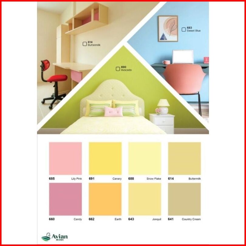 SW Super White, 624 M. White, 694 Abu-abu, 690 Avocado, 680 Green Tea, 681 Cool Dream, 683 Sweet Blue, 670 Ivory, 661 Leafy, 686 Grand Ocean, 663 Azure, 685 Lily Pink, 691 Canary, 688 Snow Flake, 614 Buttermilk, 660 Candy, 662 Earth, 643 Jonquil, 641 Country Cream