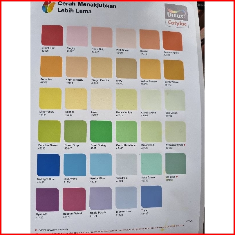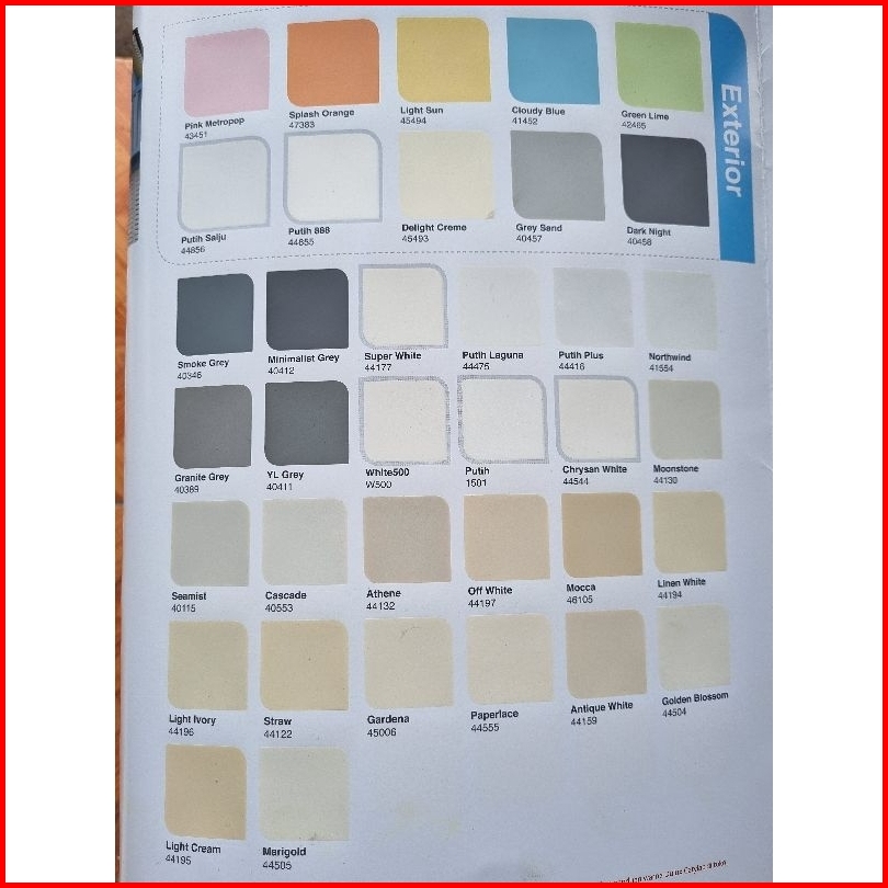 Putih 888, White500, Putih Plus, Chrysan White, Moonstone, Light Ivory, Straw, Paperlace, Golden blossom, Light Cream, Cloudy Blue, Venice Blue, Lime, Off white, Mocca, Blue Anchor, Pingky, Dreamland, Teardrop, Seamist, Cascade, Gardena, Antique White, Marigold, Grey Sand, Pink Metropop, Athene, Putih Salju, Rosy pink, Delight Creme, Window Garden, Sensational Mood, Tranquil Blue, Jade Green, Pink snow, Ivory Sparkle, Super White, Ice Blue, Sealer Sc Interior, Hilarious Hessian, Brilliant White 2290, Sky High Blue, Clean Apricot, After The Rain, Ivory Beige, Unicorn White, Yucca White, Purest forst, Shy Violet, Avocado White, Eloquent Ivory, Ghost grey, Vogue Violet, Northwind