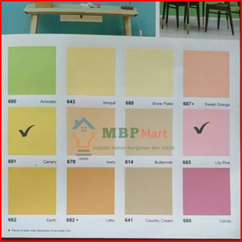 691 - canary, 685 - lily pink, 683 - sweet blue, 663 - Azure, 661 - leafy, 694 - abu abu, SW - Super White, 690 - avocado, 686 - grand ocean, 688 - snow flake, 681 - cool dream, 680 - green tea, 670 - ivory, 662 - earth, 660 - candy, 643 - jonquil, 641 - country cream, 624 - m white, 614 - buttermilk