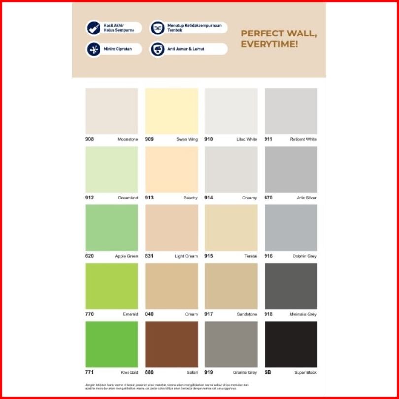 Putih, 101, 113, 114, 115, 116, 120, 108, 109, 110, 117, 118, 119, 121, 124, 112, 102, 1759T (Hijau Sage), Frozen Violet, 670, 916, 919, 917, 918, 831 Light Cream, 246 Pearl White, 911, 040, 908, 915, Beige Harmony, R15 003, White as snow, R14-003, G27 001, N9 001 White Oakwood, G27-004, Cotton puff, Super White, Vanila 1453, High Tea, PS-7, 1798T, 1992P Stiletto Grey, N17 004 Grey Sidewal, Y7-004, B20-002, 44555 Paperlace, N22 001 Linen Sheet, N7 001, N3 003 Peace on Eart, Brilliant White, OW 1011P Soft Tissue, N22 002 Rock Oyster, N10 001 Soft Cushion, A44195 Light Cream, Sage Green 6013, OW 1010P Walden Whit, N9 002 Inner Beauty, N4 001, N23 001, N23 003 Titanium Gre, N33-002 Girl Scout C, Y3-005 Always Creamy, N32-004 Sandy Beach, 910 Lilac White, N7 001 Dovetail Whit, N4 001 Earth White, B8 003 Swimming Home, N21 002 Full Moon, Y20 001 Sunny Lemon, O2 001