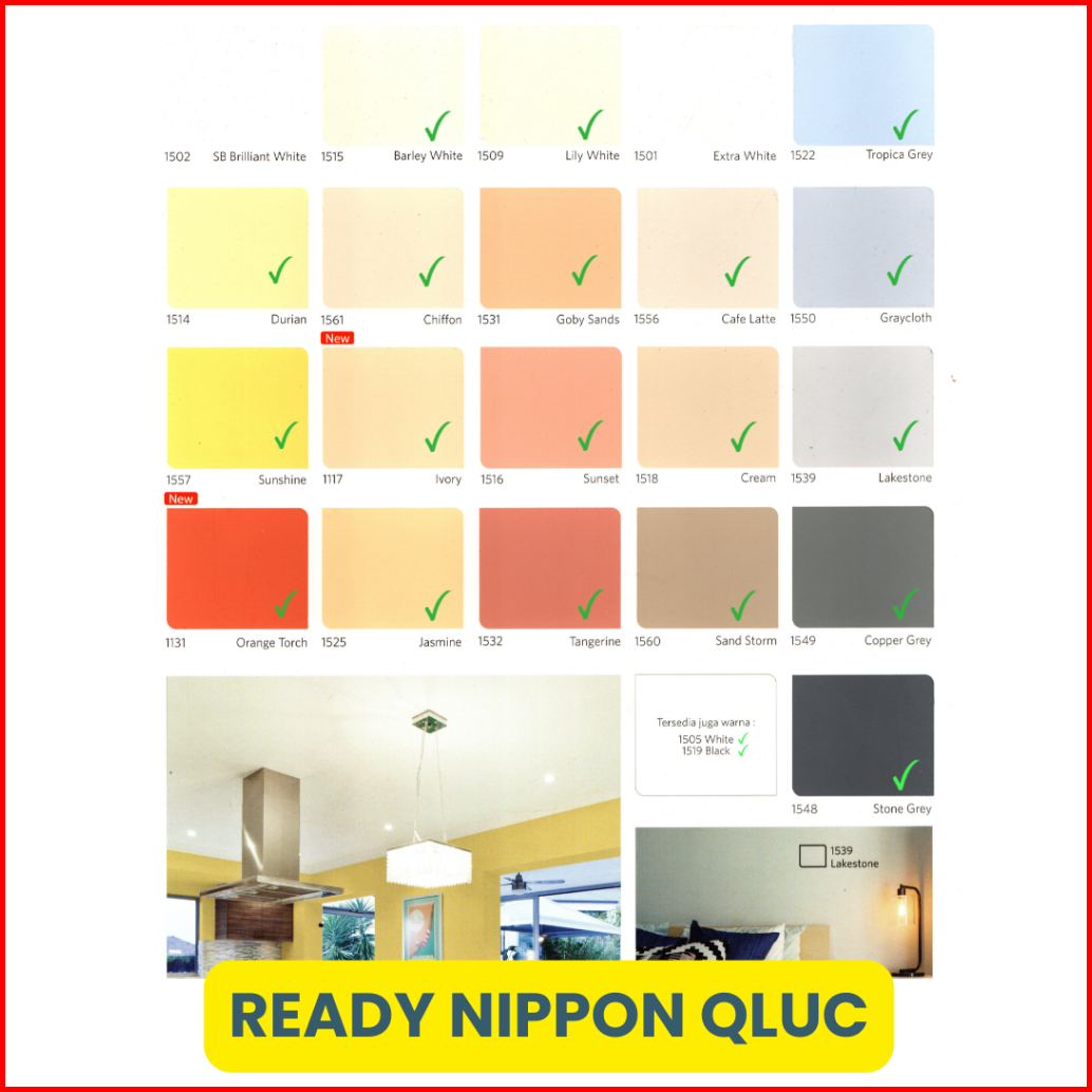 1505 white, 1519 black, 1503 blue white, 1524 fresh green, 1546 lime green, 1558 baby baby, 1559 lilac dream, 1154 hijau telor, 1657 bright green, 1552 pink posy, 1553 lavender print, 1534 marina, 1671 moon glow, 1540 freeway, 1562 candy pink, 1555 peace blue, 1547 swimming blue, 1541 atlantic, 1523 victoria, 1554 happy fuschia, 1526 blue beauty, 1515 barley white, 1509 lily white, 1522 tropica grey, 1514 durian, 1561 chiffon, 1531 goby sands, 1556 cafe latte, 1550 graycloth, 1557 sunshine, 1117 ivory, 1516 sunset, 1518 cream, 1539 lakestone, 1131 orange torch, 1525 jasmine, 1532 tangerine, 1560 sandstorm, 1549 copper grey, 1548 stone grey, NEW! Spring Vigor, NEW! 1533 Sky Blue, NEW! 1691 Golden Hon, NEW! 1688 RealMorado