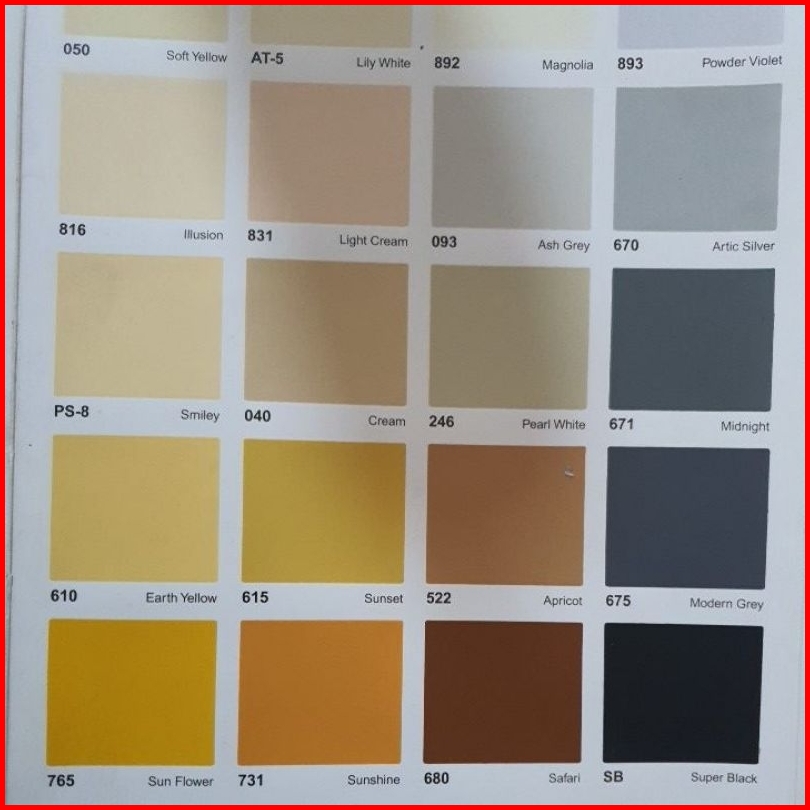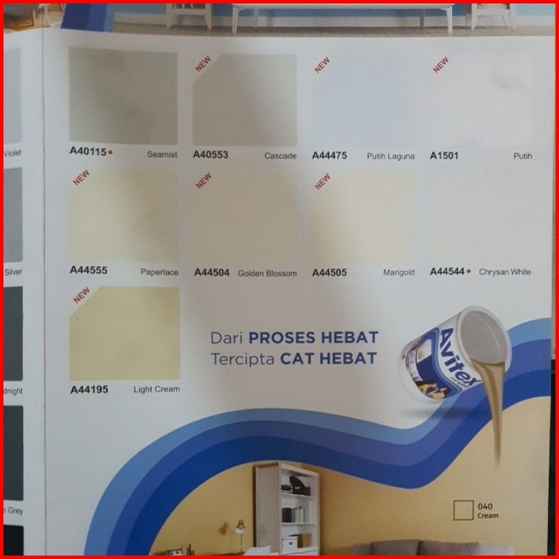 651 CARNATION PINK, AT-1 BARLEY WHITE, 816 ILLUSION, 040 CREAM, 650 SWEET PINK, 812 FLAMINGGO, 610 EARTH YELLOW, 522 APRICOT, 720 CANDY PINK, 630 TANGERINE, 730 ORANGE JUICE, 680 SAFARI, 735 BRIGHT RED, 725 CHERY PINK, 745 FIESTA, AT-4 ROSE WHITE, 892 MAGNOLIA, AT-5 LILY WHITE, PS 8 SMILE, 752 CHAMPAGNE, 050 SOFT YELLOW, 831 LIGHT CREAM, 750 SUNNY YELLOW, 751 LEMON BURST, 740 LEMON YELLOW, 760 FRESH MINT, 615 SUNSET, 755 GOLDEN YELLOW, 775 TROPICAL, 620 APPLE GREEN, 731 SUNSHINE, 765 SUN FLOWER, 770 EMERALD, 260 GREEN BAY, 896 M WHITE, SW SUPER WHITE, 622 FRESH GREEN, 818 FRESH MINT, 602 SKY WAY, PS-7 ESCTATIC, 621 COOL LIME, 776 TELUR ASIN, 601 BLUE ROMANCE, 710 MOON GLOW, 772 TEMPTATION, 712 TELUR BEBEK, 600 BLUE HARMONY, 660 LILAC FROST, 771 KIWI GOLD, 711 AQUA MARINE, BGG 1758D TORRENTS, PUTIH BASE A, PUTIH BASE B, N14 003 WINTER SLEEP, P3 002 LAVENDER OIL, P20 001 TOUCH OF FAL, P20 005 HERBAL REMED, N23 003 TITANIUM GRE, N22 001 LINEN SHEETS, N4 002 LOUNGE VIBE, 675 MODERN GREY, A44195 LIGHT CREAM, N9 001 WHITE OAKWOOD, B18 006 OCEAN WONDER, 1759T HIJAU SAGE, A44504 GOLDEN BLOSSO, AVITEX TOP SW PUTIH, A1501 PUTIH, N8 003 LAIDBACK SUND, Y12 001 CREAMY MILKS, N12 005 SMALL WONDER, G28 006 TRULY GREEN, N32 005 HIGH TEA, N5 001 WHITE AS SNOW, A44475 PUTIH LAGUNA, N 1831P ALMOND CHIP, 246 PEARL WHITE, N22 002 ROCK OYSTER, OW 1016P CREAMY WHIT, OW 1011P SOF TISSUE