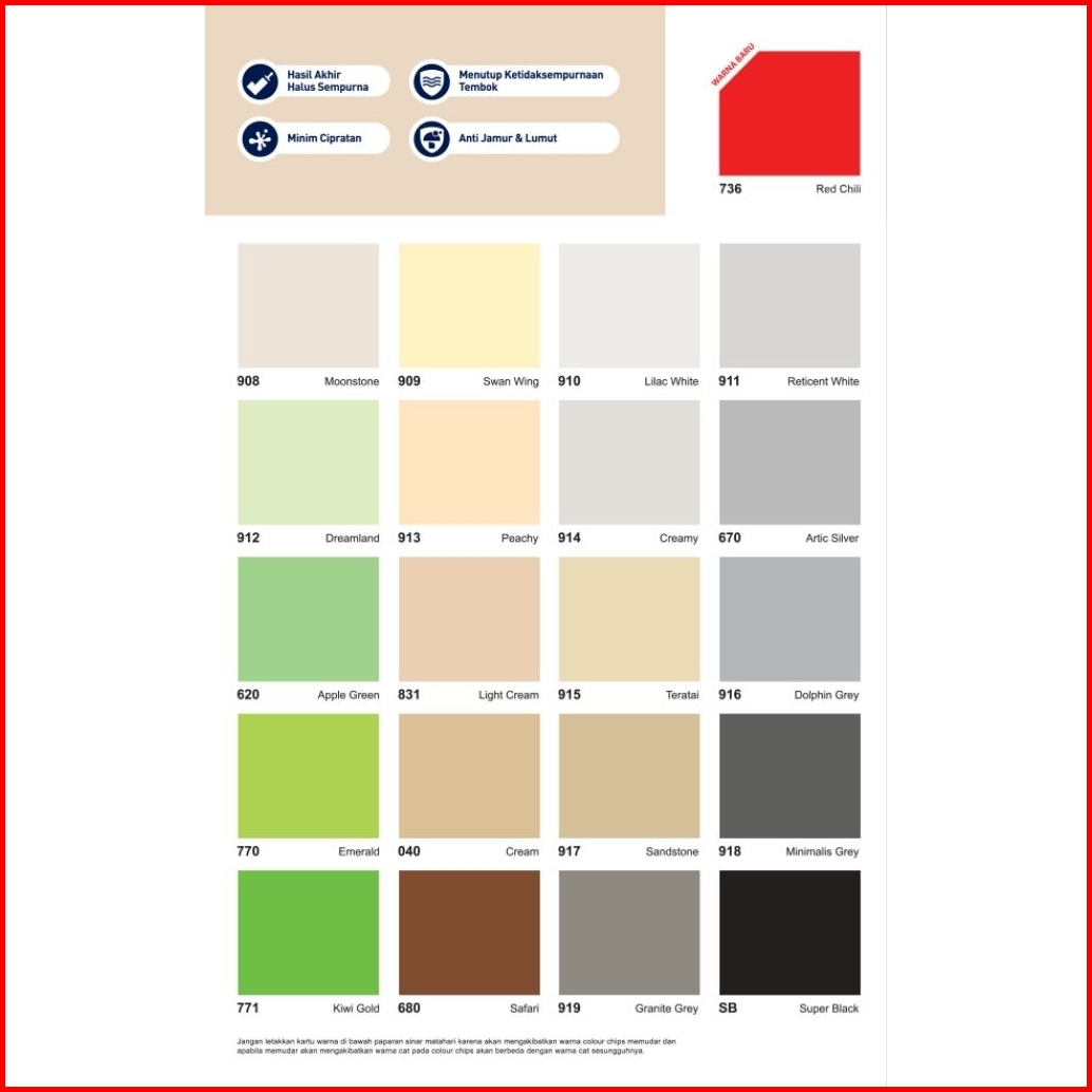 SW SUPER WHITE, 902/SUPRA WHITE, 901/MARIGOLD, 903/BRILLIANT WHITE, 752/CHAMPAGNE, 904/PINKY, 905/M.WHITE, 906/CITRUS GROVE, 755/GOLDEN YELLOW, 720/CANDY PINK, 602/SKYWAY, 907/MINTY, 765/SUN FLOWER, 725/CHERY PINK, 601/BLUE ROMANCE, 710/MOON GLOW, 745/FIESTA, 735/BRIGHT RED, 700/AZURE BLUE, 712/TELUR BEBEK, 908/MOONSTONE, 909/SWAN WING, 910/LILAC WHITE, 911/RETICENT WHITE, 912/DREAMLAND, 913/PEACHY, 914/CREAMY, 670/ARTIC SILVER, 620/APPLE GREEN, 831/LIGHT CREAM, 915/TERATAI, 916/DOLPHIN GREY, 770/EMERALD, 040/CREAM, 917/SANDSTONE, 918/MINIMALIS GREY, 771/KIWI GOLD, 680/SAFARI, 919/GRANITE GREY, SB SUPER BLACK, PUTIH BASE B, CUSTOM ORDER, 736/RED CHILI