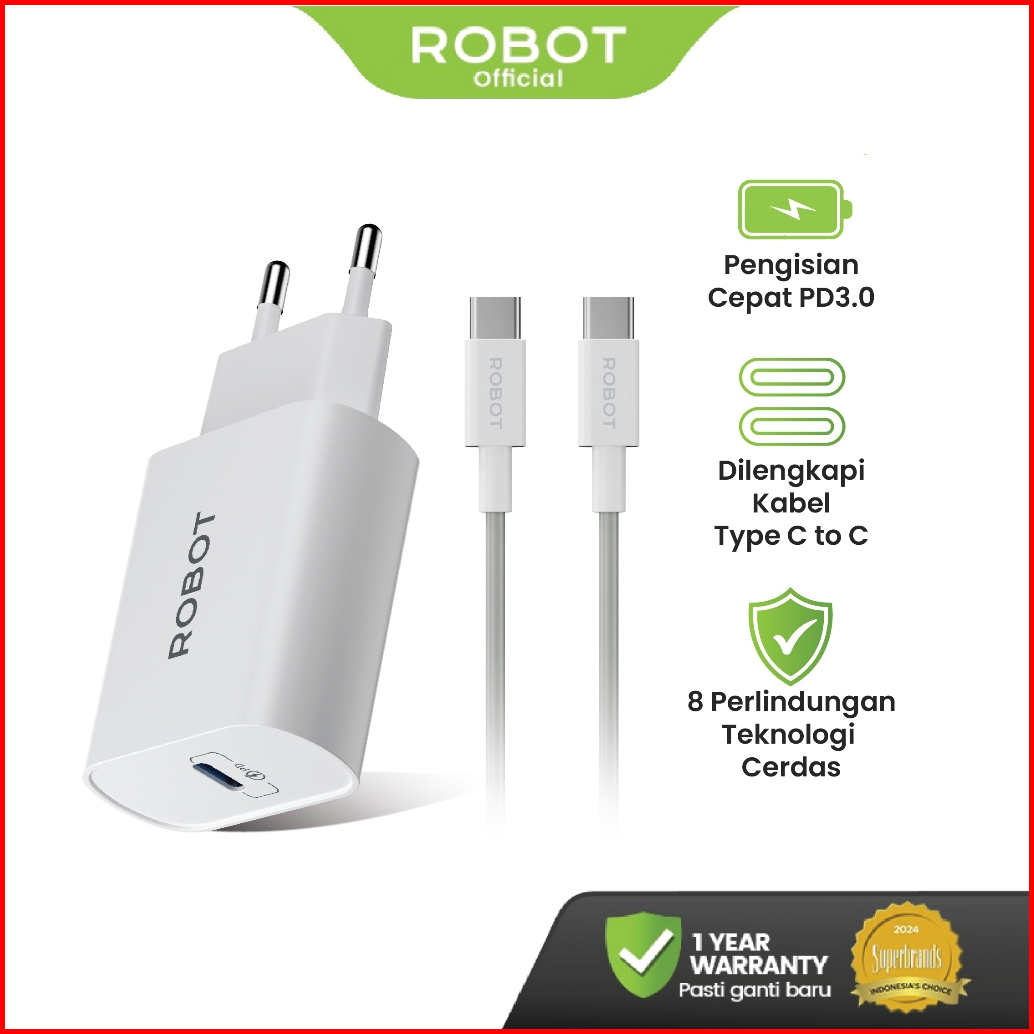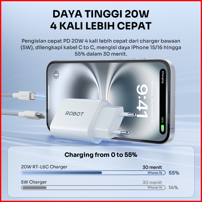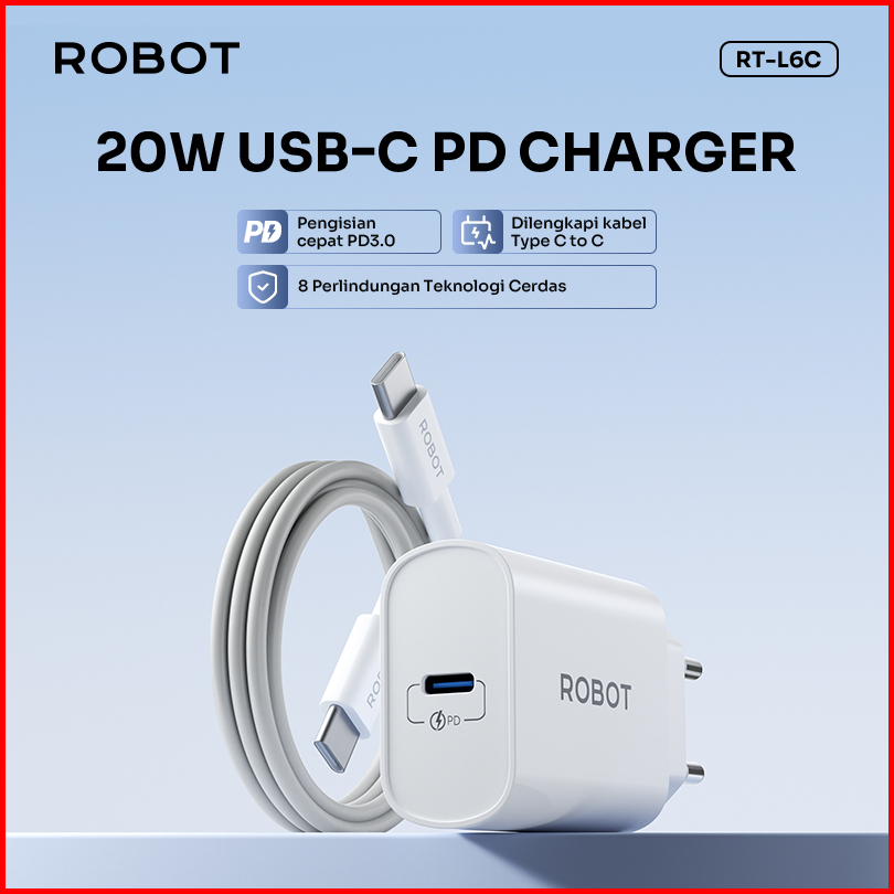 Robot Adaptor Charger 20w Pd 3.0 Usb C Fast Charging Iphone Samsung Type C Free Kabel C To C Rt-l6c Original
