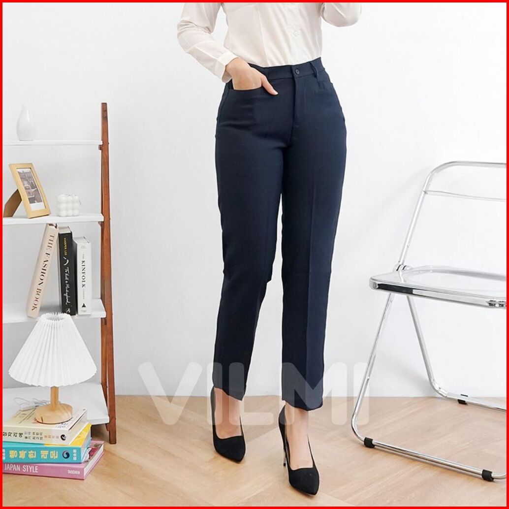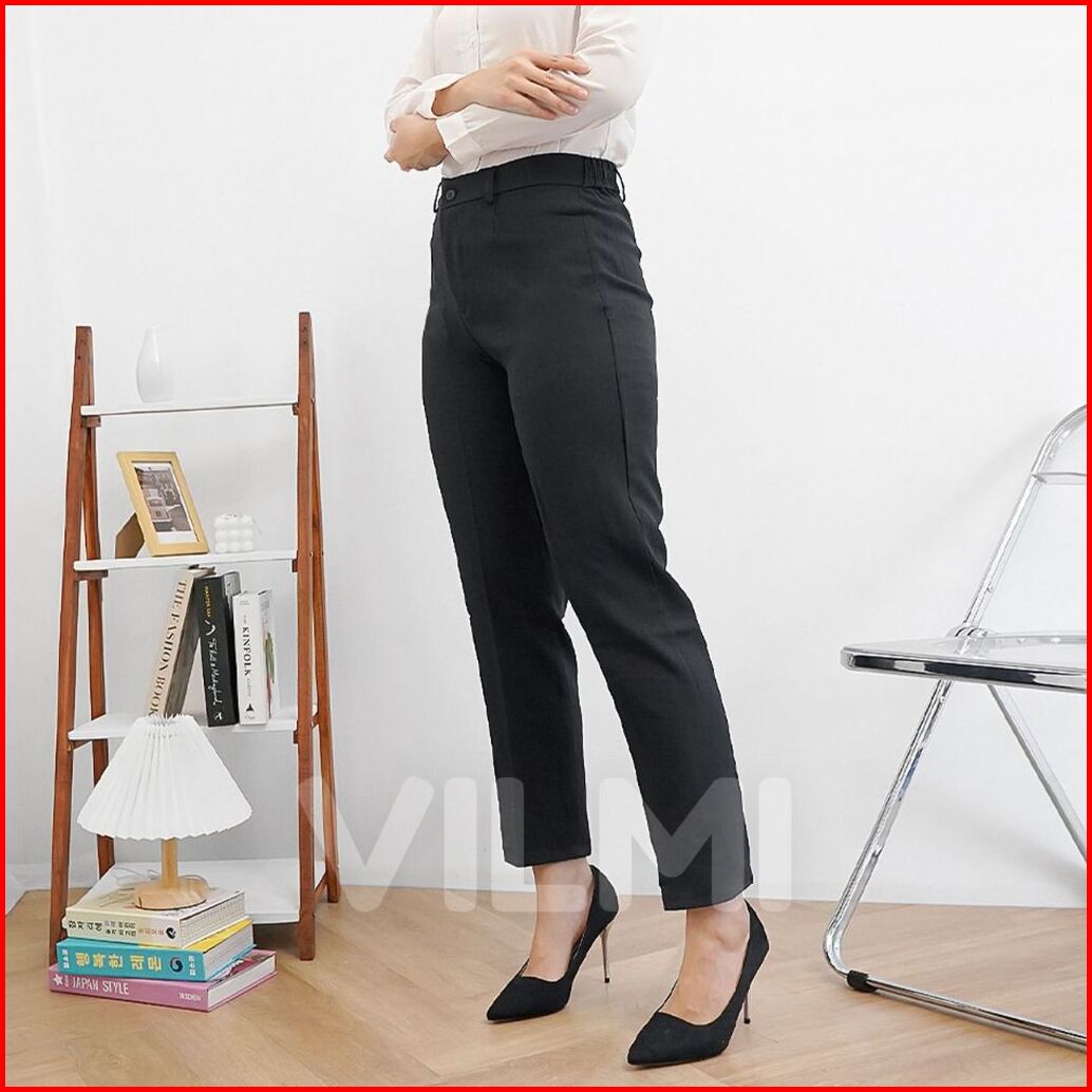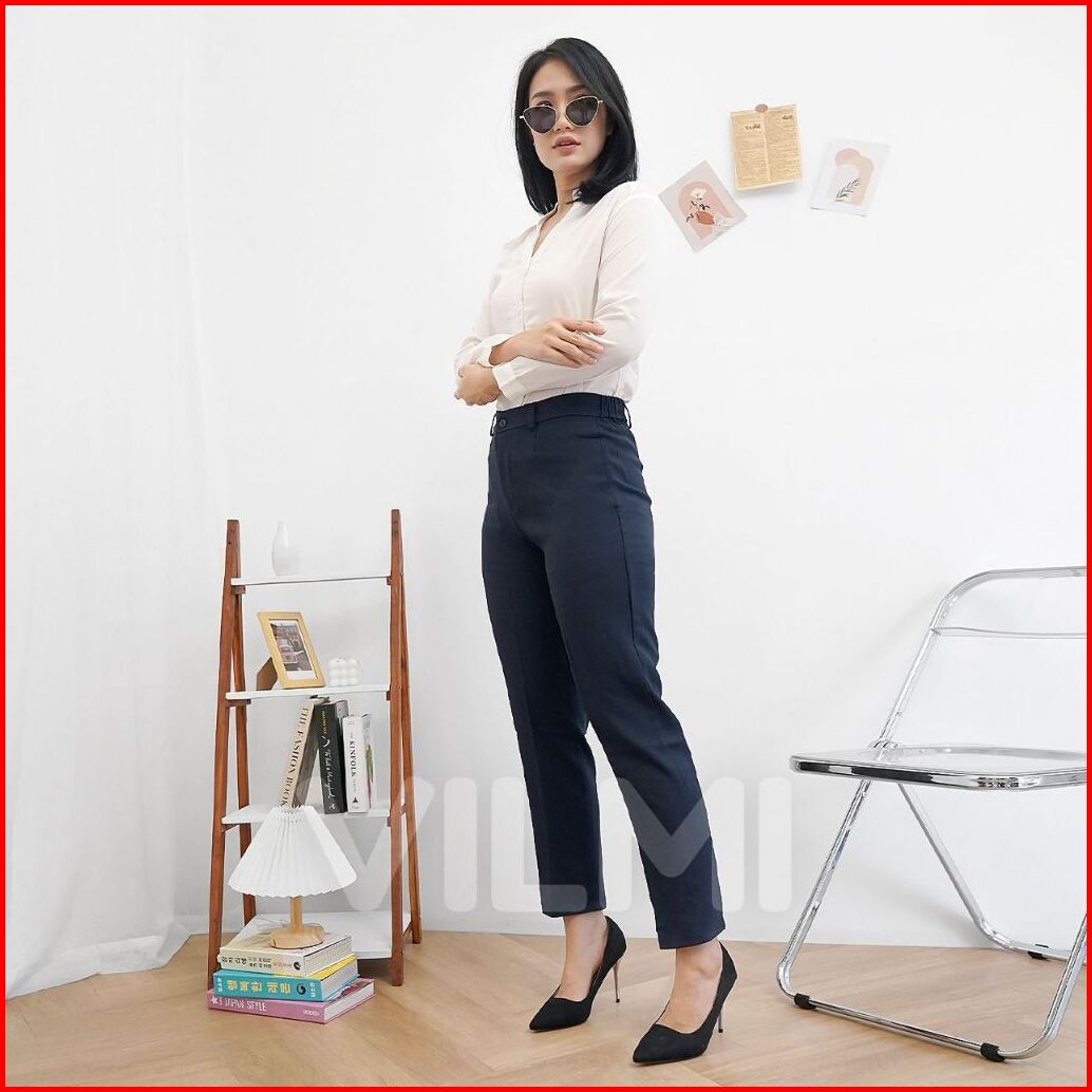 Vilmi Celana Kerja Kantor Wanita Celana Formal Bahan Kancing Resleting Pinggang Karet Sisi Samping Semi Wool Polyester