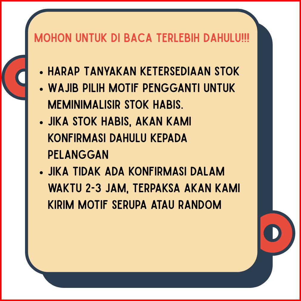 Lovely Rabbit, Lovely Bear, Dino Roar, Dinosaurus, Doraemon, Doraemon Koran, Flaminggo, Happy Bear, Jungle Friend, Lotso, Little Bear, Spiderman Merah, Spiderman Biru, Spongebob, Stitch, Telolet, Teddy Bear, Keroppi, Mickeymouse, Moon Cow, Astro Giraffe, Cute Cat, Hello Kitty, Winni The Pooh, Motif Dikirim Random, Monokorobo, Grid Cat, Labubu, Astronot, Bugs Bunny, Shopping Bear