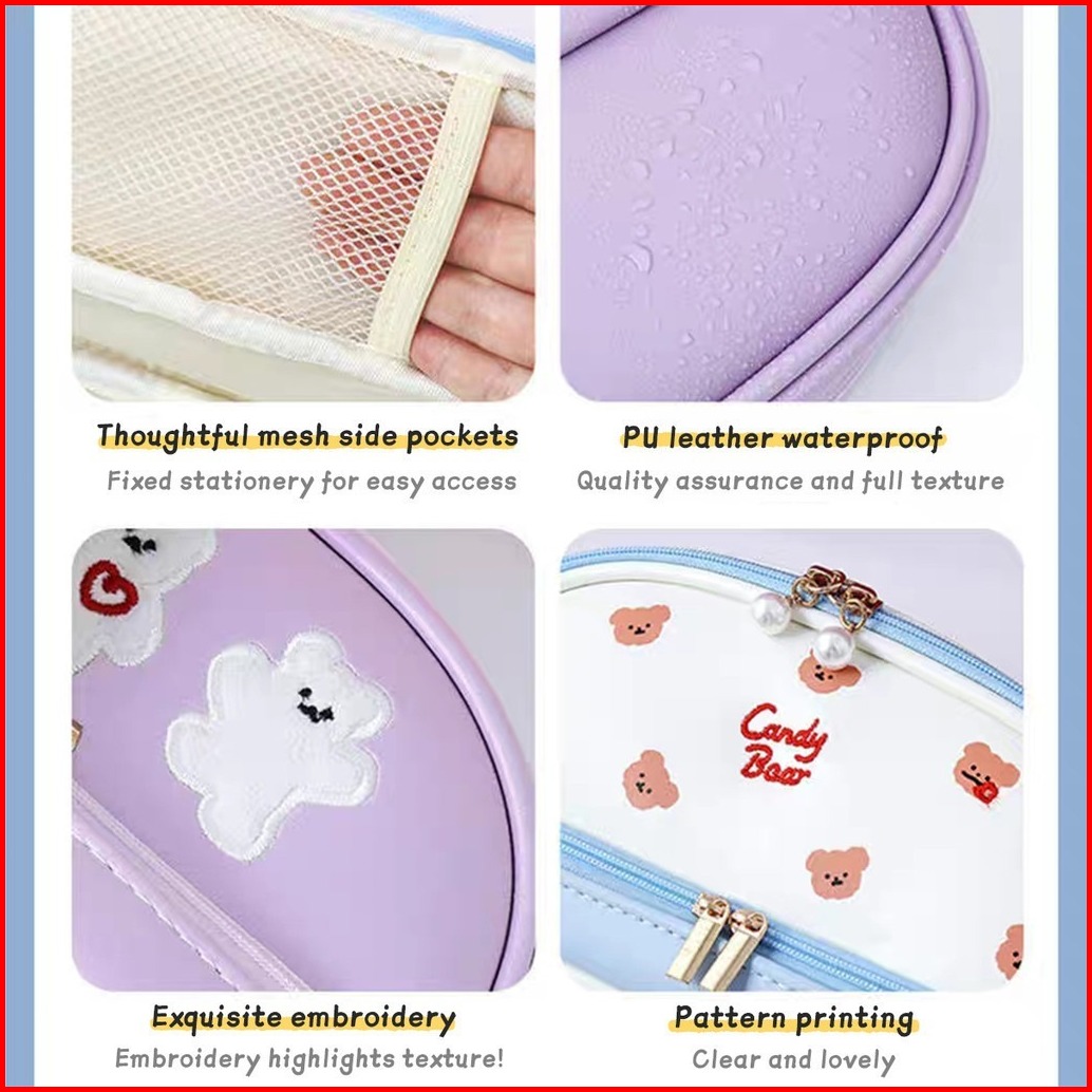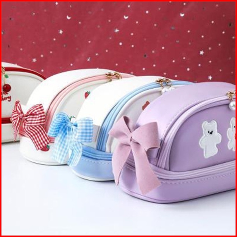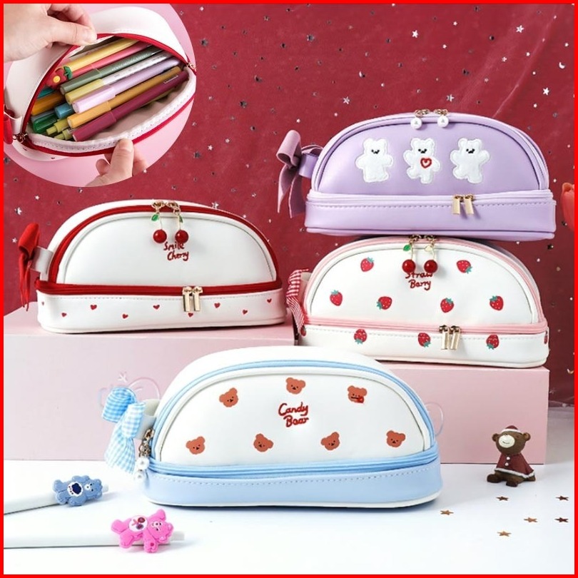Kawaii Tas Pensil Kapasitas Besar Pu Lapisan Ganda Portable Stroberi Ceri Tas Pulpen Siswa Perlengkapan Alat Tulis Sekol