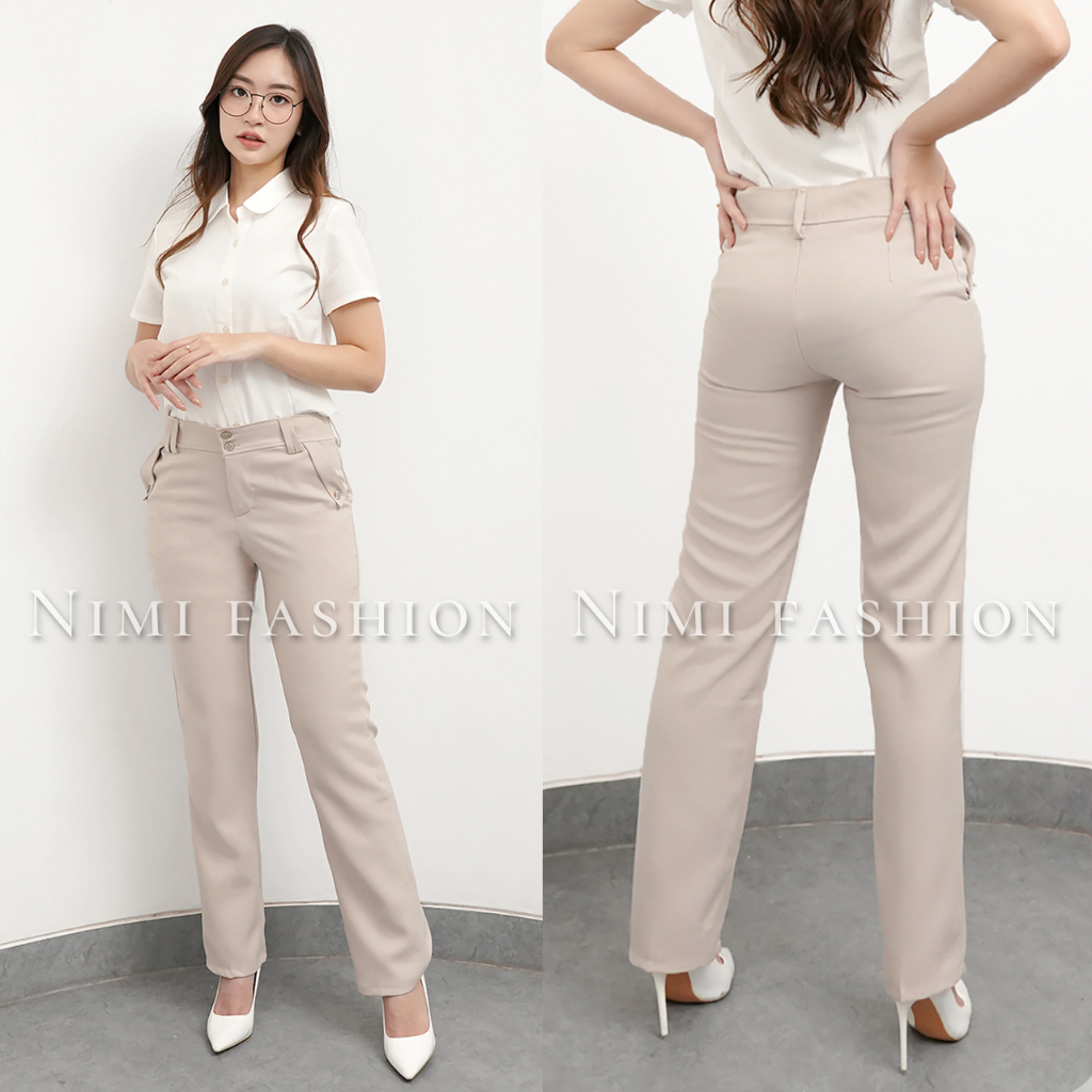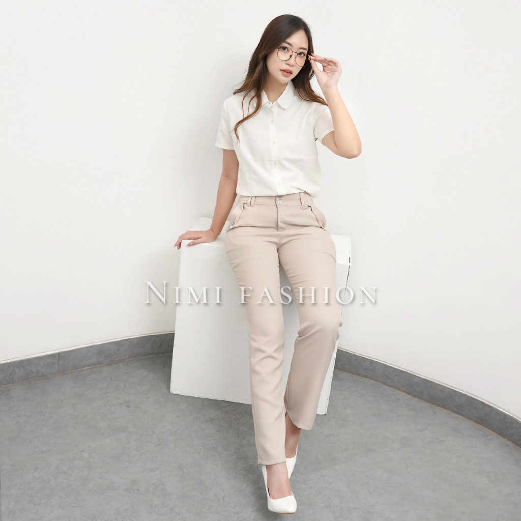 Nimi - Celana Kerja Kantor Reguler Formal Cream Pinggang Kancing Resleting Wanita