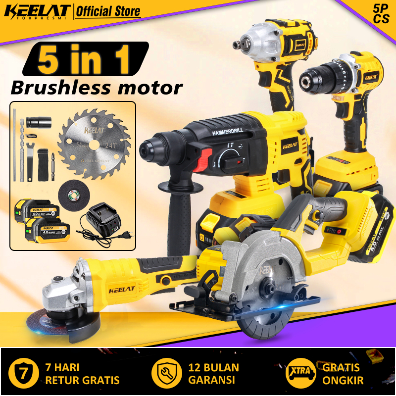 KEELAT 5-in-1 Brushless Mesin Bor Cordless Impact Wrench Impact Drill Hammer Drill Angle Grinder Same LXT Battery in One Box Tool Set