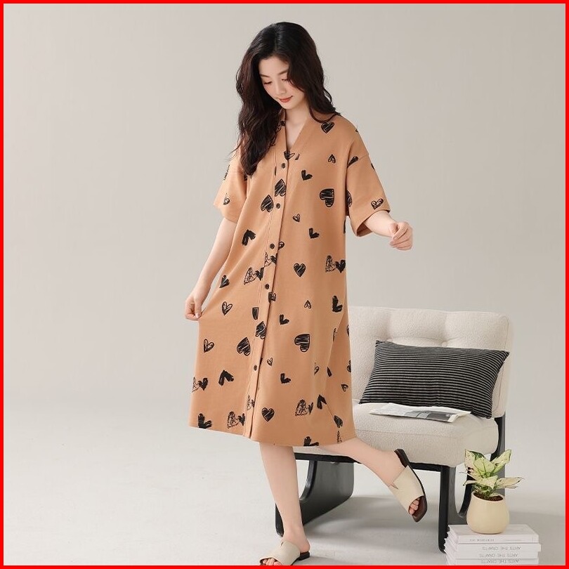 2025 Sleebee Gaun Tidur Midi Motif Hati Warna Cokelat - Kerah V Kancing Depan Nyaman Stylish Keyword Gaun Tidur Motif Ha