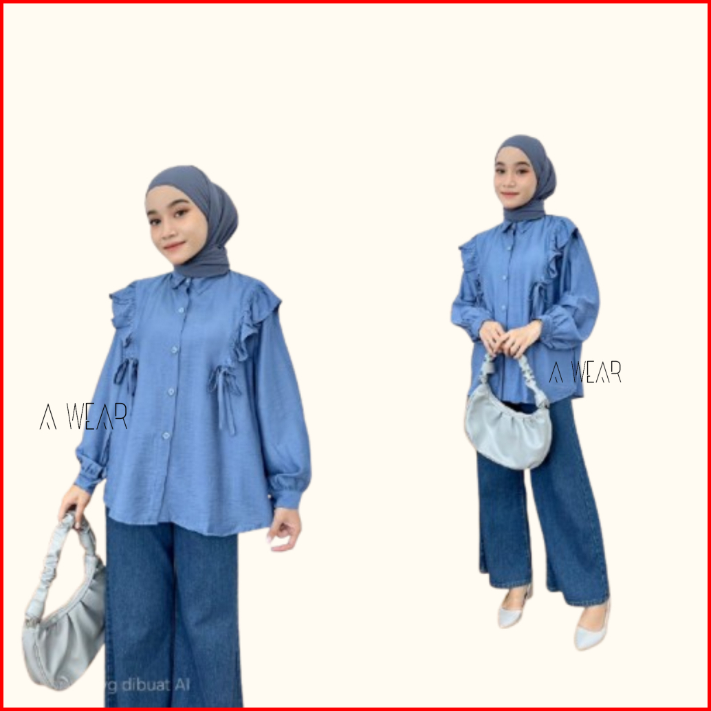 A Wear - Inara Blouse Atasan Wanita Bahan Polo Linen Ruffle Full Kancing