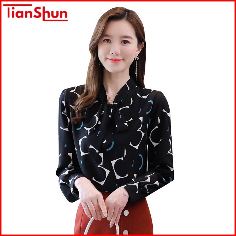 Tianshun Korean Long Sleeve Women Blouse Sifon Merah Muda Hitam Dan Putih Blouse Fashion Wanita Atasan Lengan Panjang Bl
