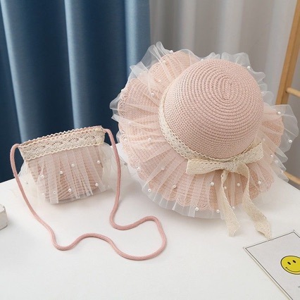 Topi Anak Topi jerami kerai anak perempuan + set tas / topi pantai renda putri / topi dan tas anak