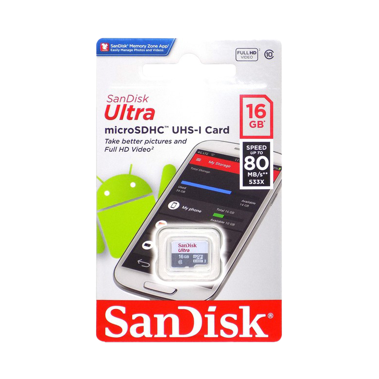 SanDisk microSDHC Ultra Card 16GB Class 10 UHS-I (Up to 80MB/s)