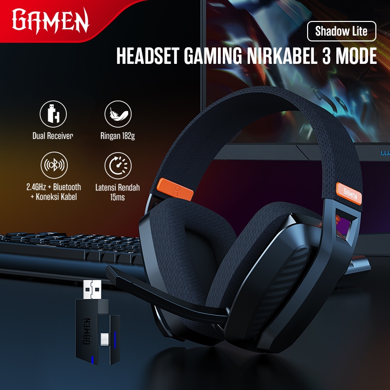 GAMEN Headset Bluetooth 5.3 Gaming Wireless Low Latency 40mm Shadow Lite 182g 3 Mode Koneksi Baterai 25 Jam Bass kuat Headphone Bluetooth