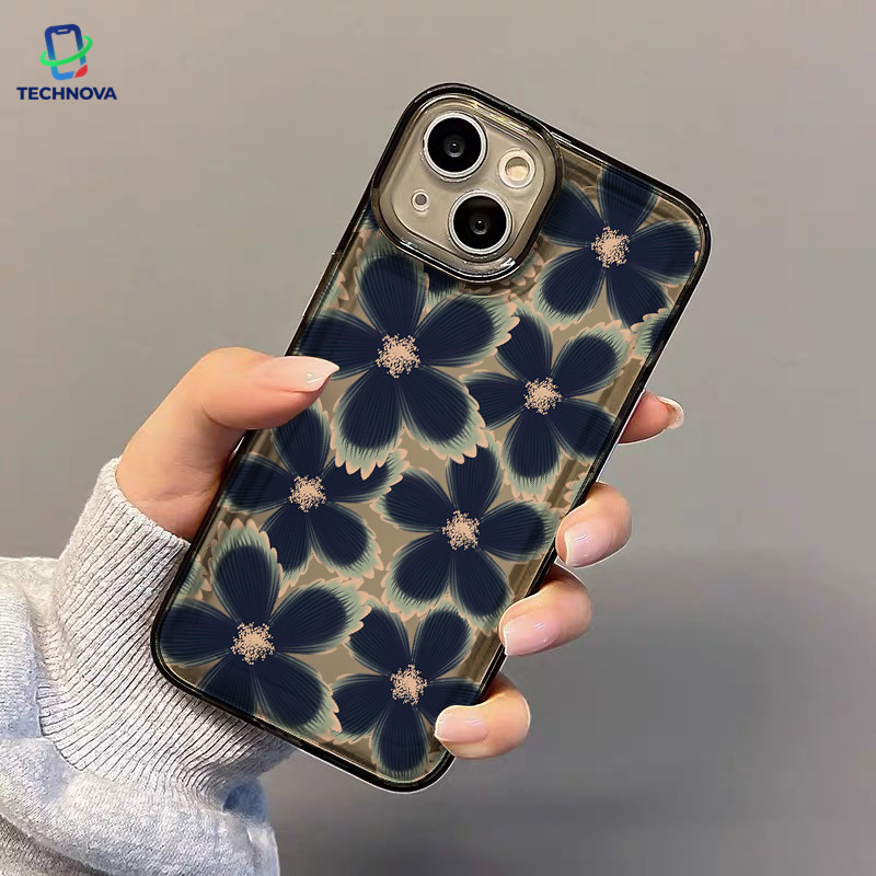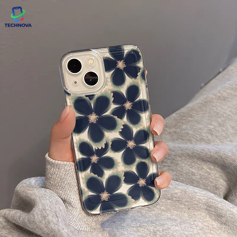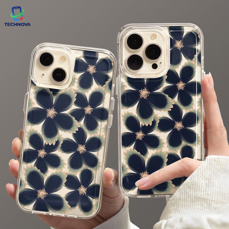 Casing IPhone Bunga hitam Transparan Soft Case Fashion Cocok untuk iPhone 11 12 13 14 15 16 Pro Max X XR XS Max 7Plus 8Plus-TA