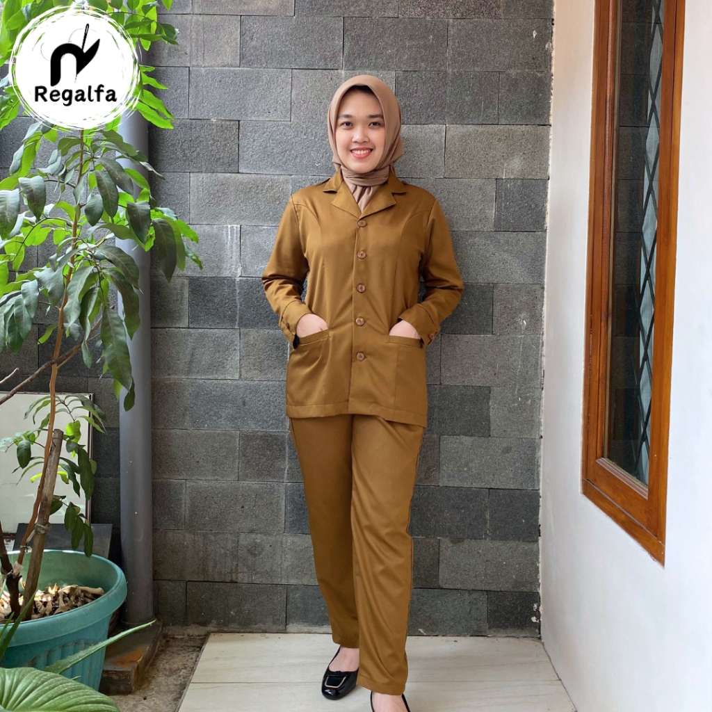 Setelan Baju Seragam PDH Khaki Tua PEMDA PNS Wanita Terbaru Model Kerah Rebah TERBARU 2024