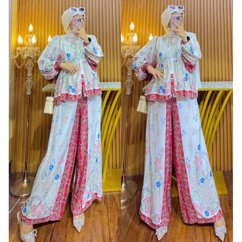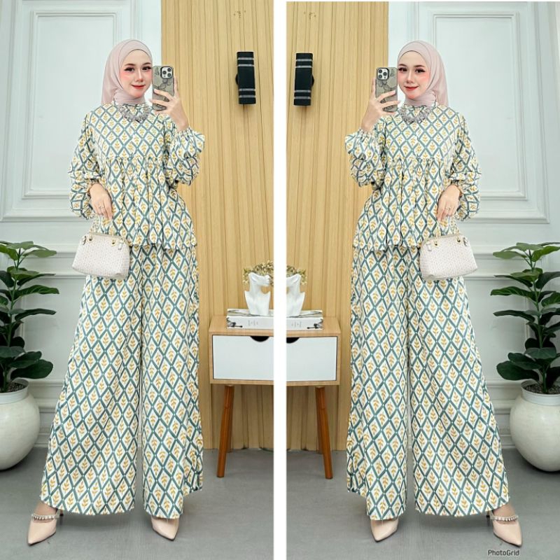 Maura Set / Setelan Celana Kulot Lengan Balon Viral / OneSet Rayon Motif Terbaru / Setelan Jumbo Lengan Balon