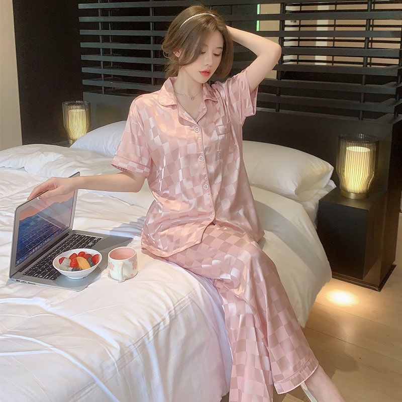2025 baru Korea wanita piyama/persegi es sutra atasan lengan pendek + celana panjang bisa dipakai di luar setelan homewear