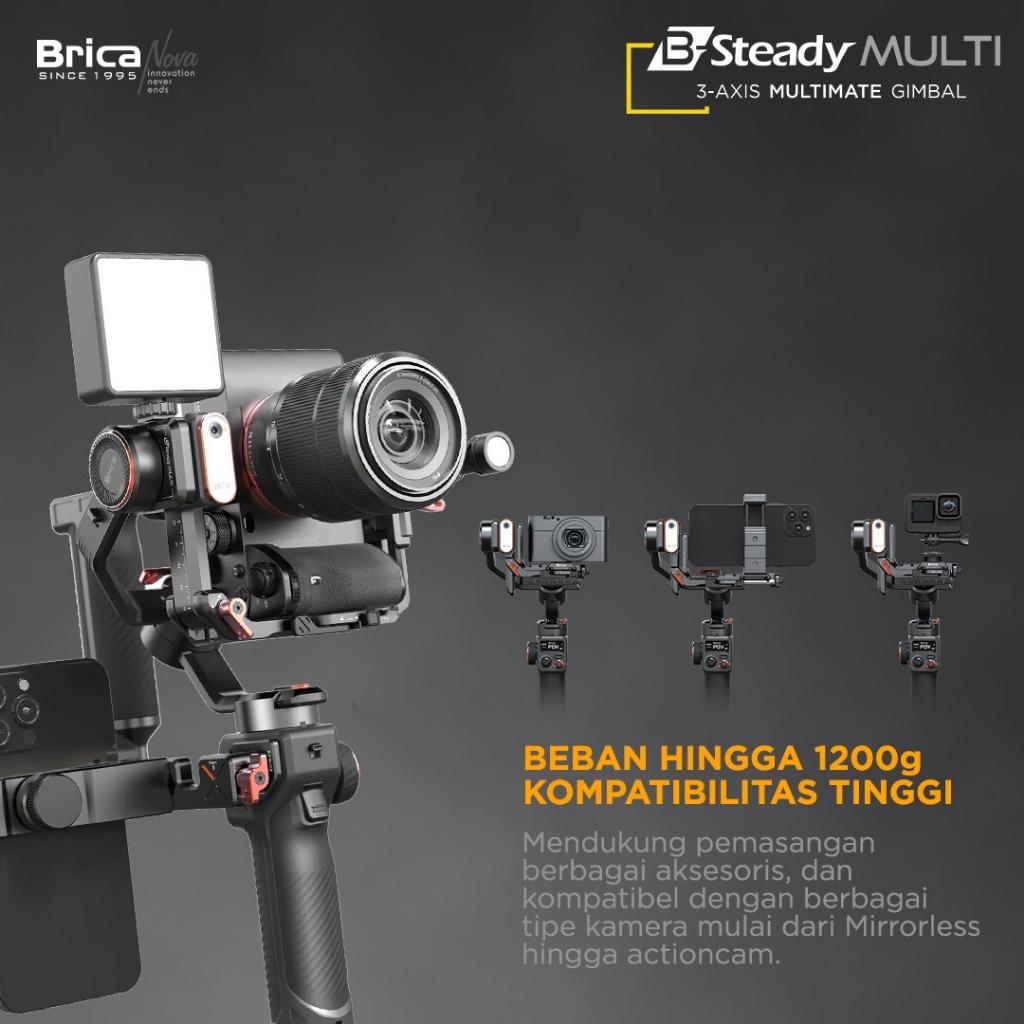 Brica B-Steady MULTIMATE - 3 Axis Mirrorless & Camera Gimbal - Free AI Vision Sensor + LED - BSMU