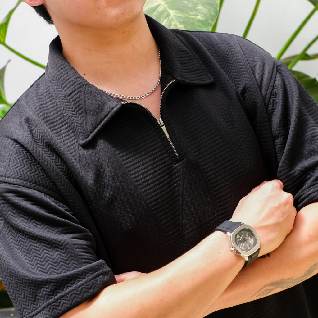 SANVANINA Zuma Zipper Boxy Polo Shirt | Kaos Polo Knit Pria | Atasan Pria Berkerah Boxy Fit Cutting