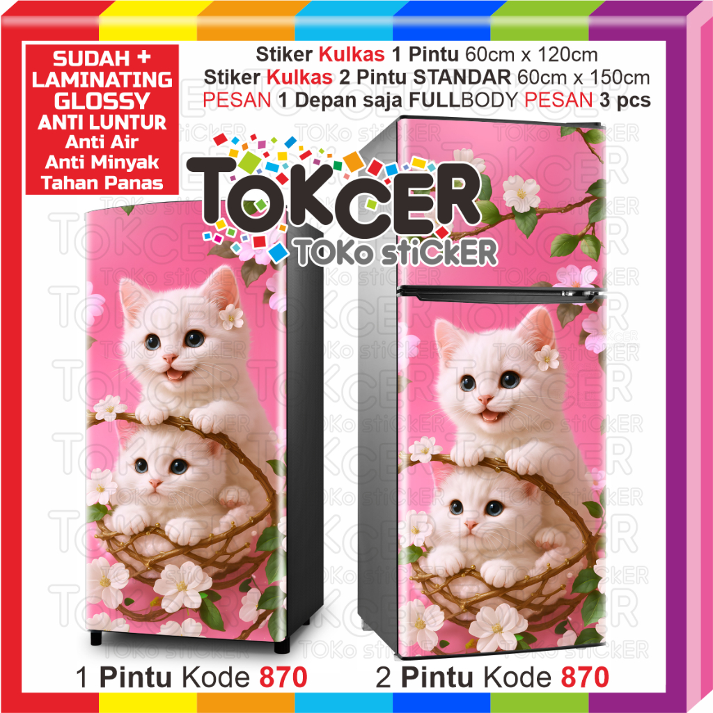 STIKER Kulkas LAMINATING GLOSSY Anti LUNTUR uk 1 Pintu atau 2 Pintu Motif KUCING