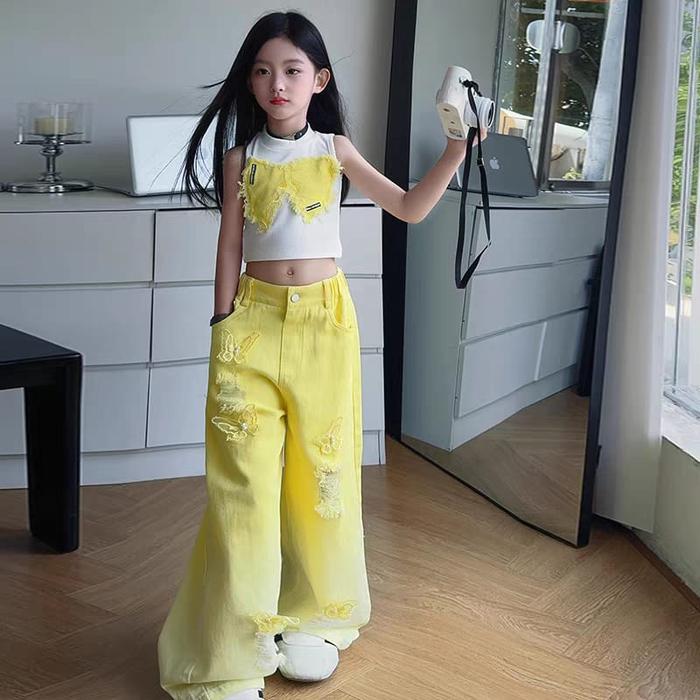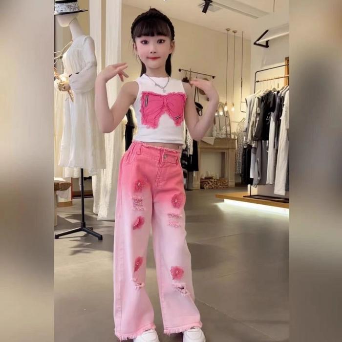Cleynkidz C99286 Baju Setelan Anak Pink Butterfly Baju+Celana Jeans Pink Fashion Kekinian - Blue, 100