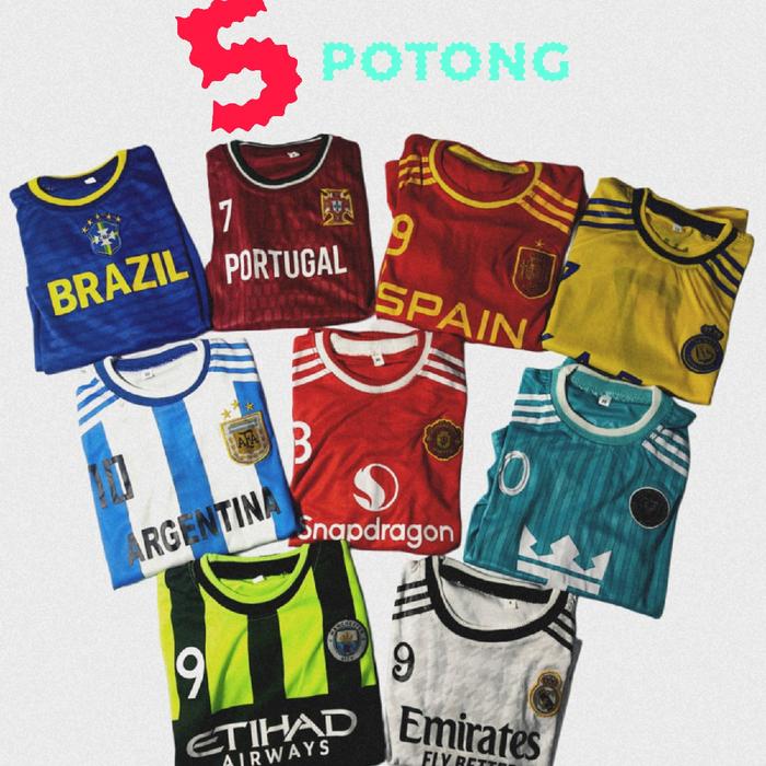 PAKET USAHA ISI 5 PCS SETELAN BAJU BOLA ANAK 1 SAMPAI 14 THN KAOS SEPAKBOLA MODEL BARU RONALDO. MESSI +CELANA JERSEY TIMNAS - CAMPUR, 1-2 THN