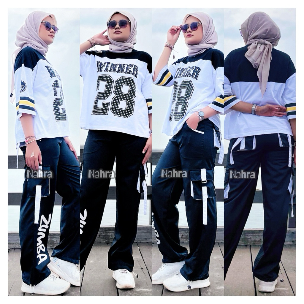 Setelan Kaos Winner 28 Unisex & Cargo Zumba 1SET Bahan Katun Combat 24s dan Celana Bahan Parasut Untuk Aktifitas Olahraga & Daily