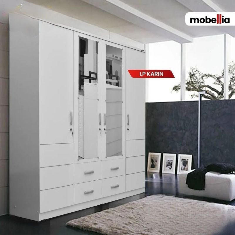 lemari pakaian 4 pintu putih modern minimalis 2 cermin 4 laci penyimpanan