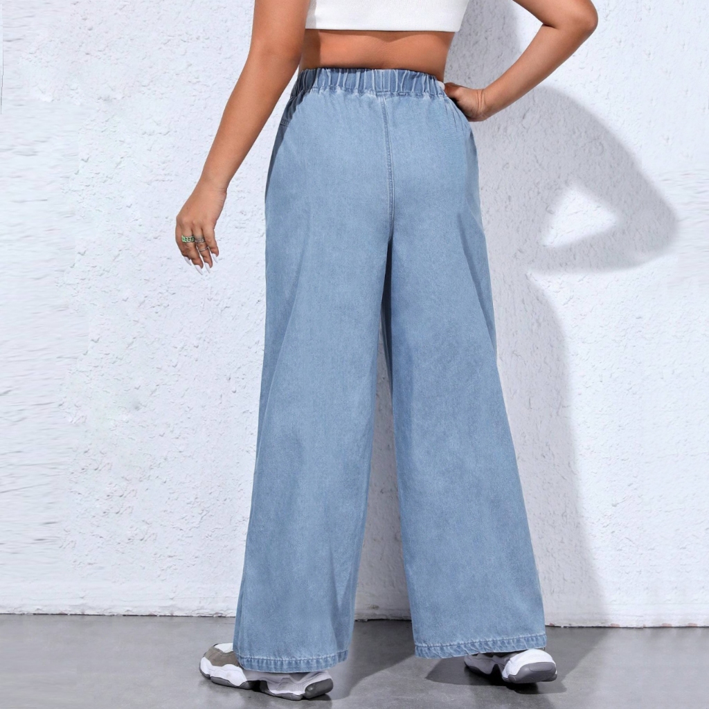 Celana Jeans Wanita Korean Style Seluar Straight Cut Wide Leg Elastic Waist Baggy Denim Jeans