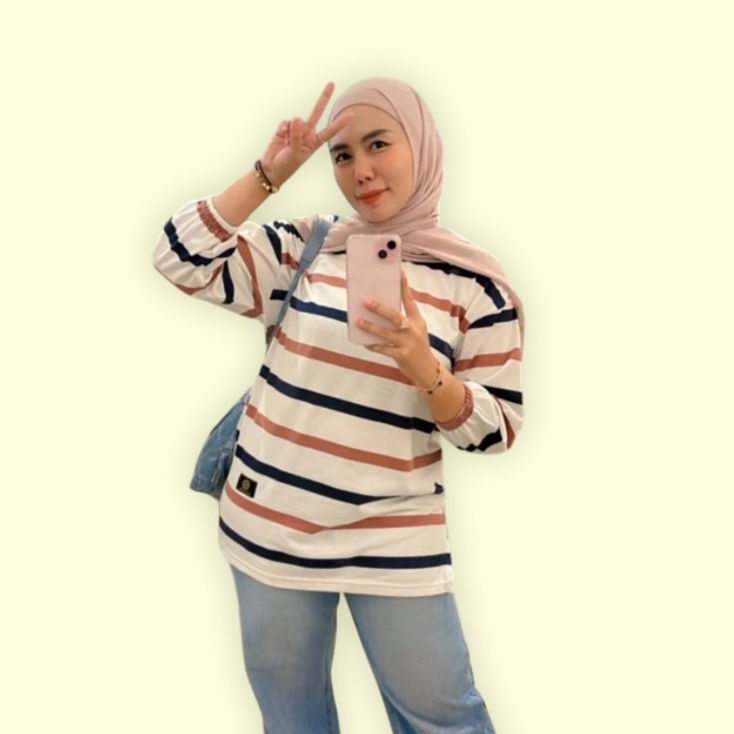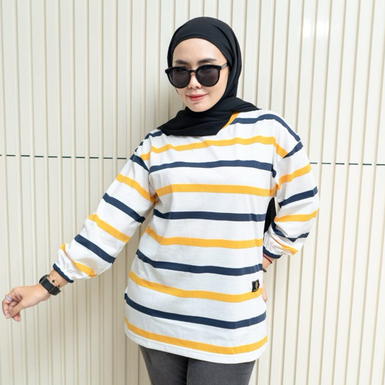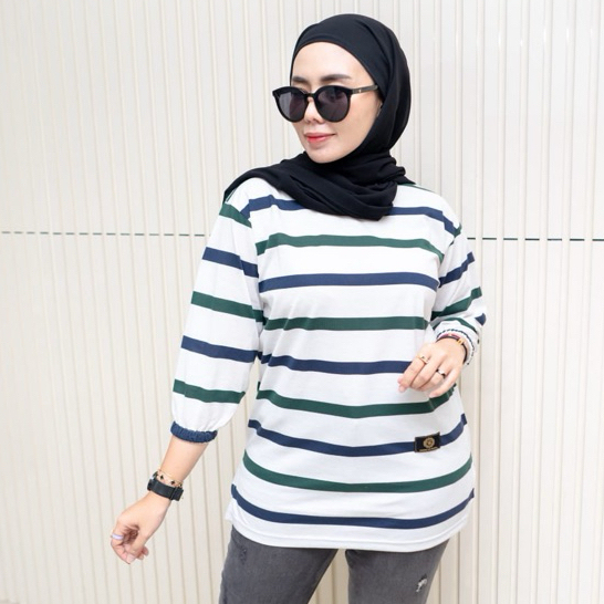 FST Kaos Oversize Wanita Garis Katun Premium Lengan 7/8 Jumbo T-Shirt Oversize Stripe Belang - Belang Salur Kaos Wanita Garis