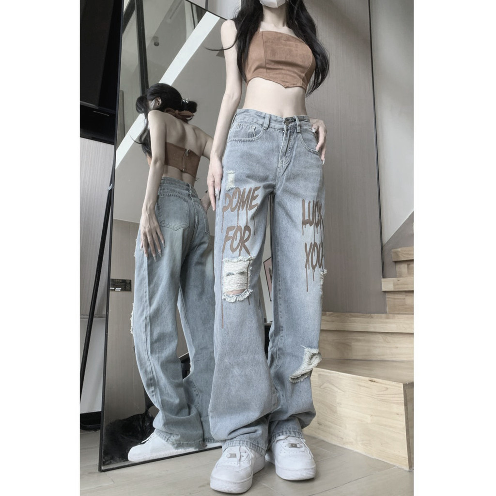S5XL Celana Jeans Robek Retro Pinggang Tinggi Wanita Korea Terbaru Celana Jeans Longgar Kasual Hip-hop