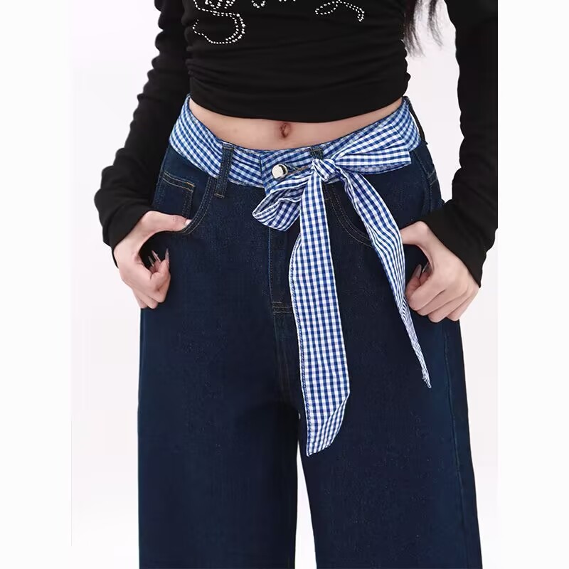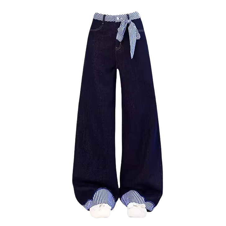 KATERMEN Jeans Wanita - Jeans Pinggang Tinggi - Celana kaki lebar dengan dasi kupu-kupu-Celana denim
