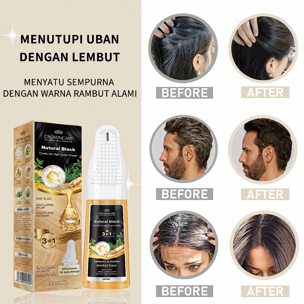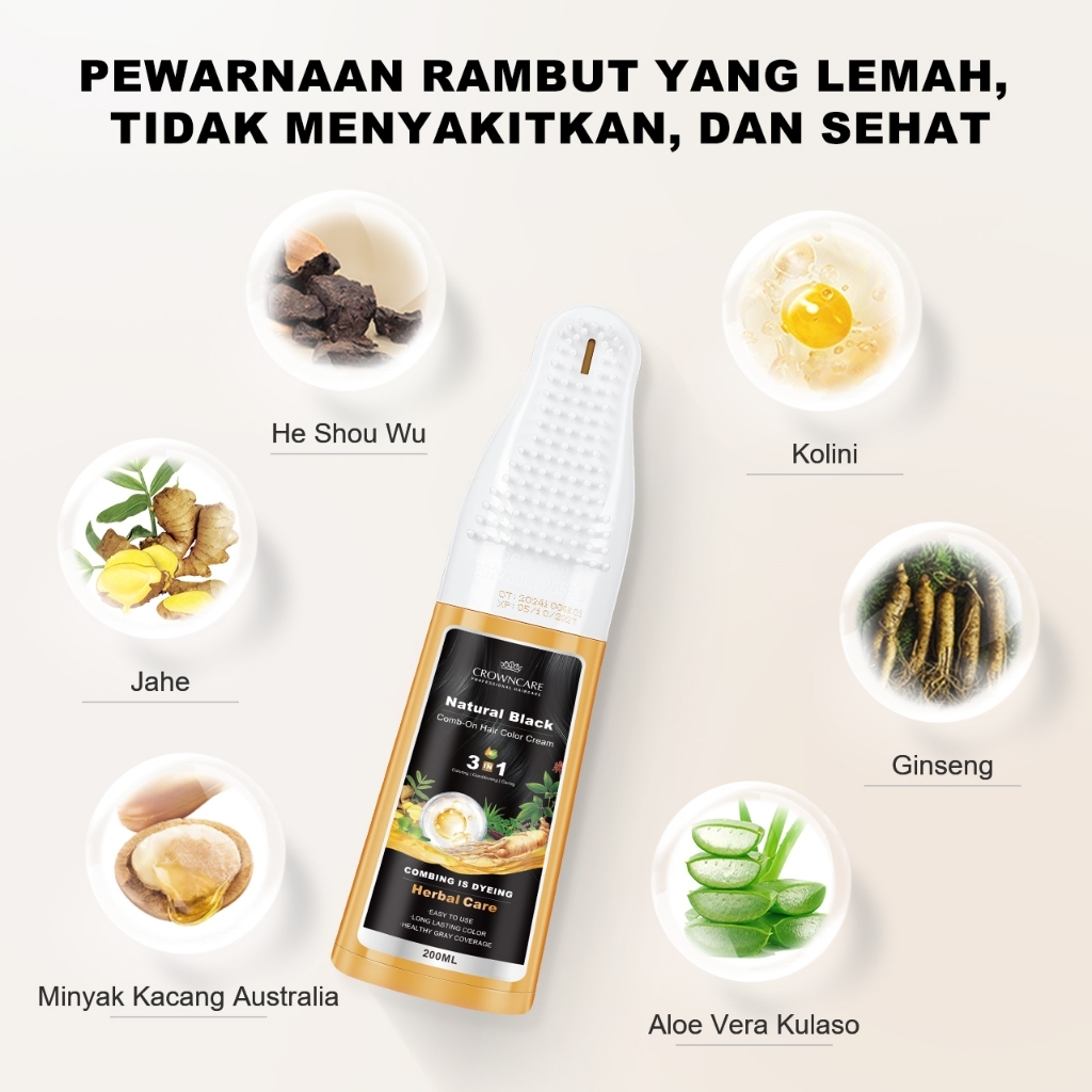 CrownCare Pewarna Rambut 200ML - Hair Color Cream Herbal, Menutup Uban dengan Cepat, Warna Tahan Lama & Efek Alami, deng