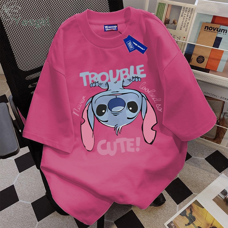 Yesgirl Korea style “TROUBLE CUTE Stitch” print kaos kasual longgar| Kaos Oversize Wanita | Fashion korean style baju kaos oversize| Baju atasan wanita terbaru 100cotton | Kaos Putih Wanita | 7.25