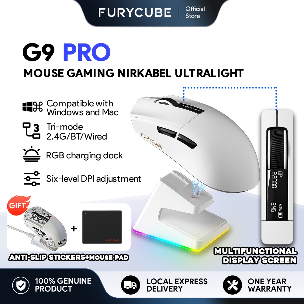FURYCUBE G9 Gaming Mouse Wireless Bluetooth High DPI PAW3311 RGB Mice Black White Mice With Base Compatible With Both La