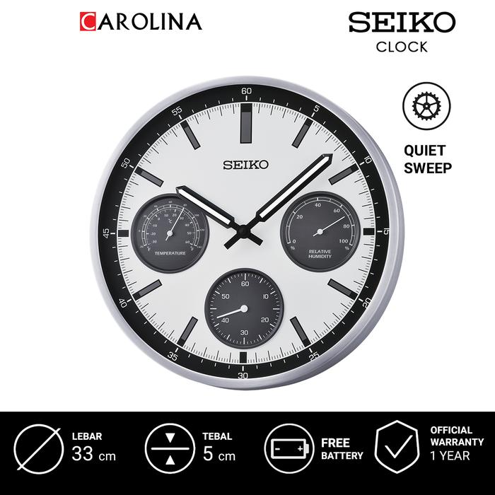JAM DINDING SEIKO ANALOG QXA823S QUITE SWEEP WHITE DIAL SILVER ALUMINUM CASE THERMOMETER HYGROMETER DECORATOR WALL CLOCK