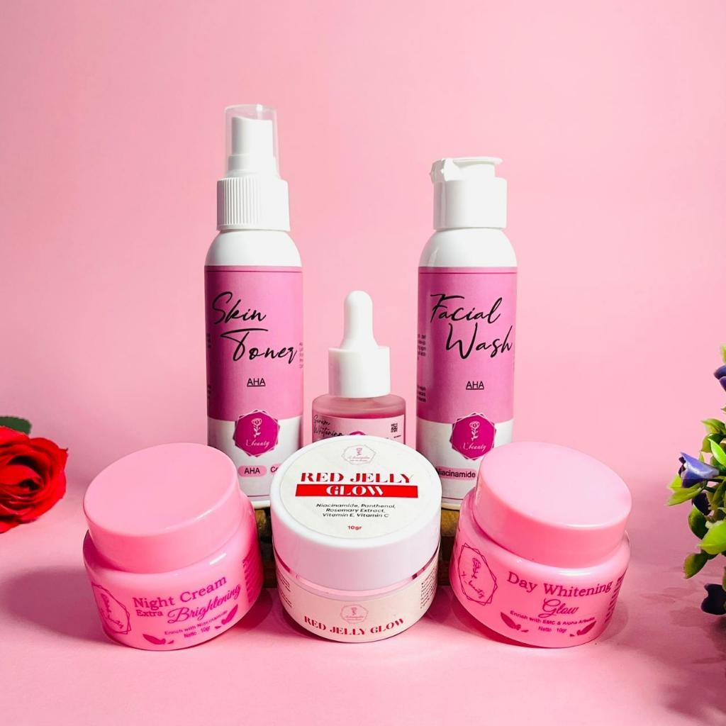 Toner, Serum, Facial wash, Night cream, 1pkt srm day pink, 1 pkt isi 6 day pink, 1 pkt day peach isi6, 1pkt day peach isi 5