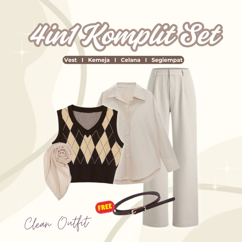 One Set Korean Style 4in1 / Vest + Kemeja + Celana + Bella Square / Outfit Hijab / One Set Hijab Ootd Kekinian / (L14N)