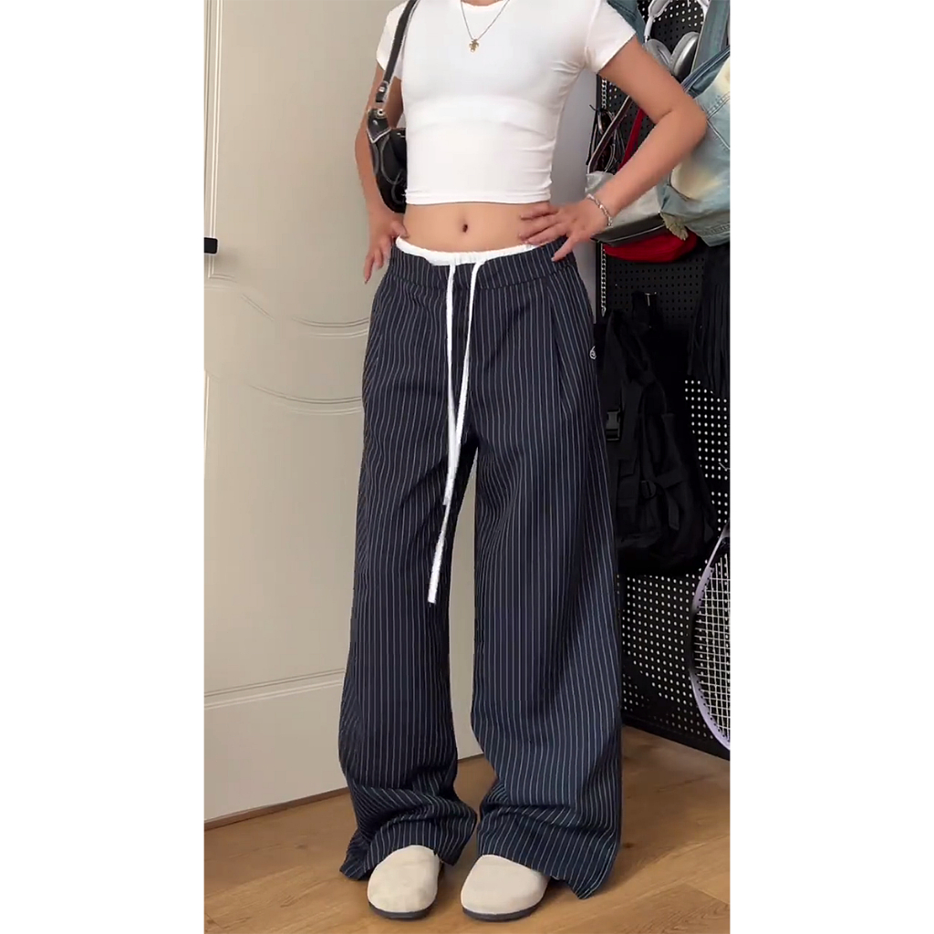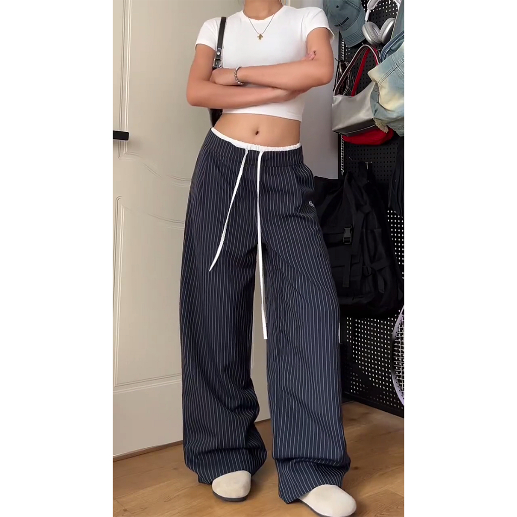 Soso biru gelap garis kaki luas celana santai wanita musim semi musim gugur santai pinggang tinggi olahraga berjalan kaki celana