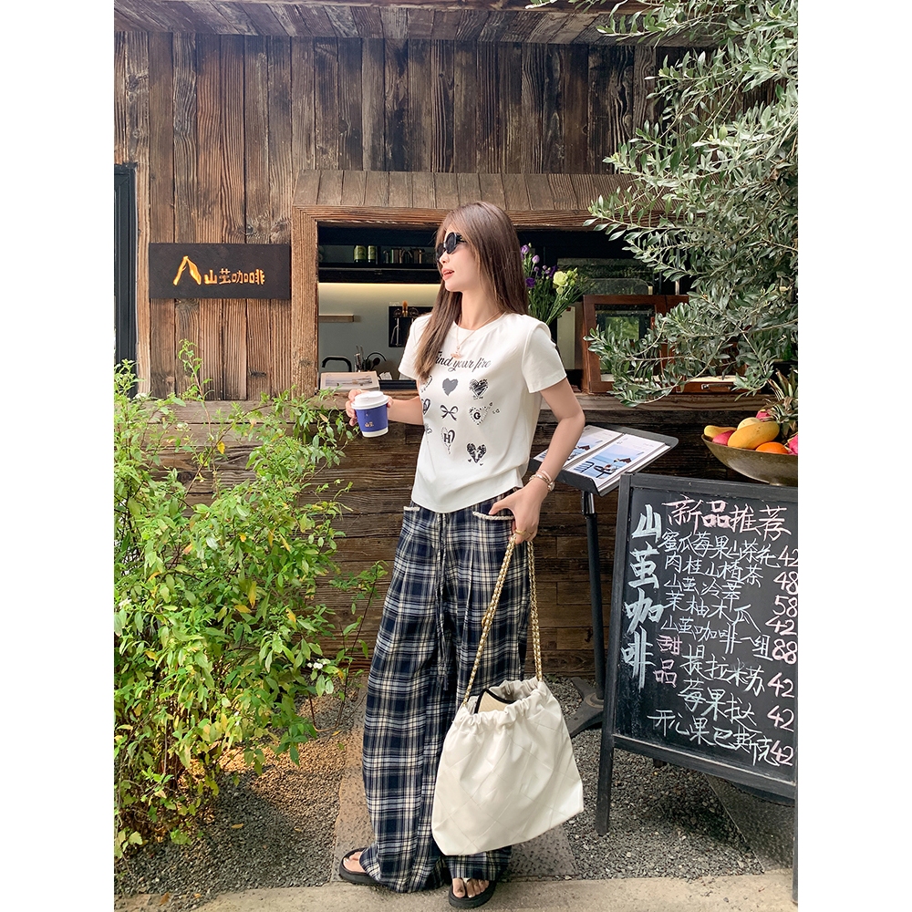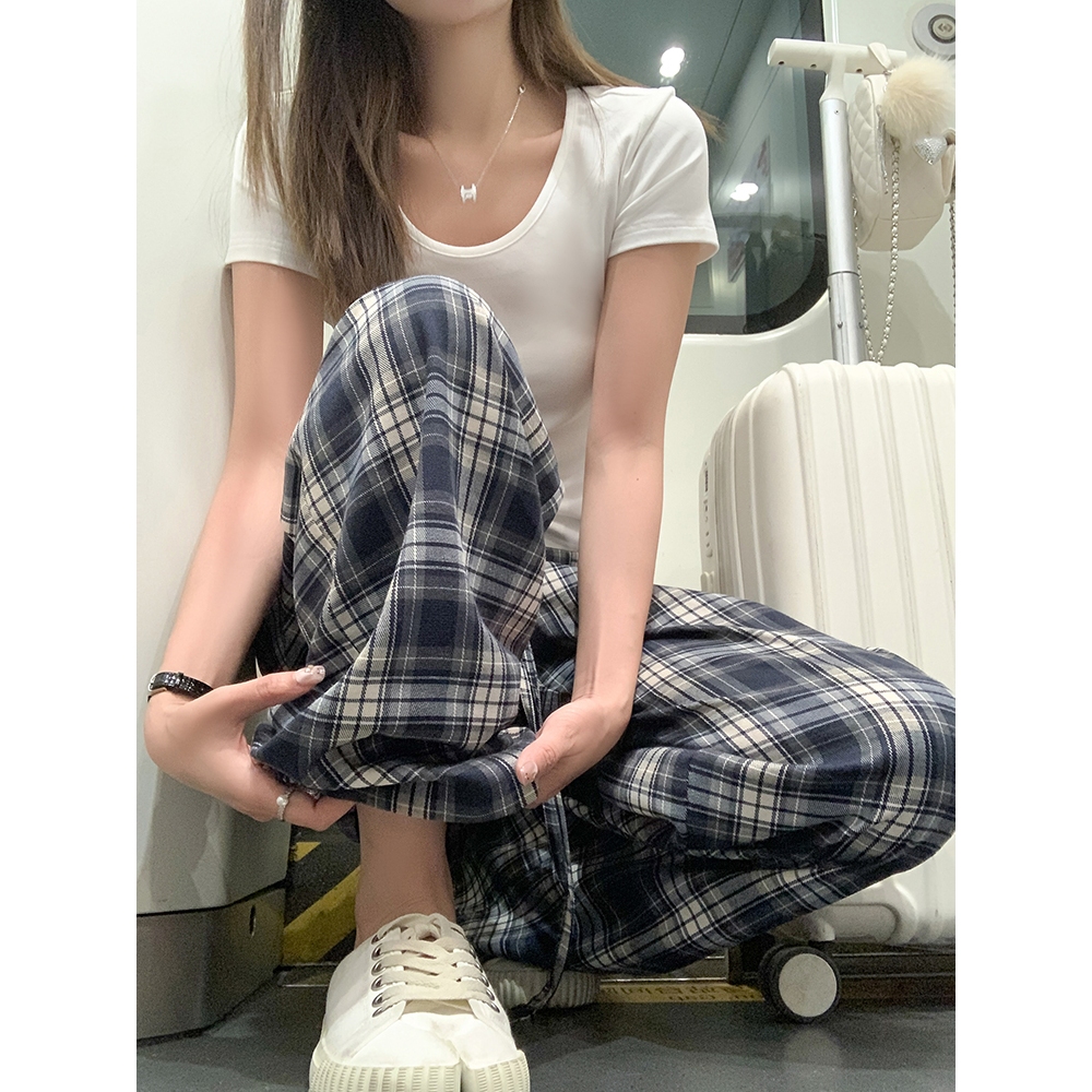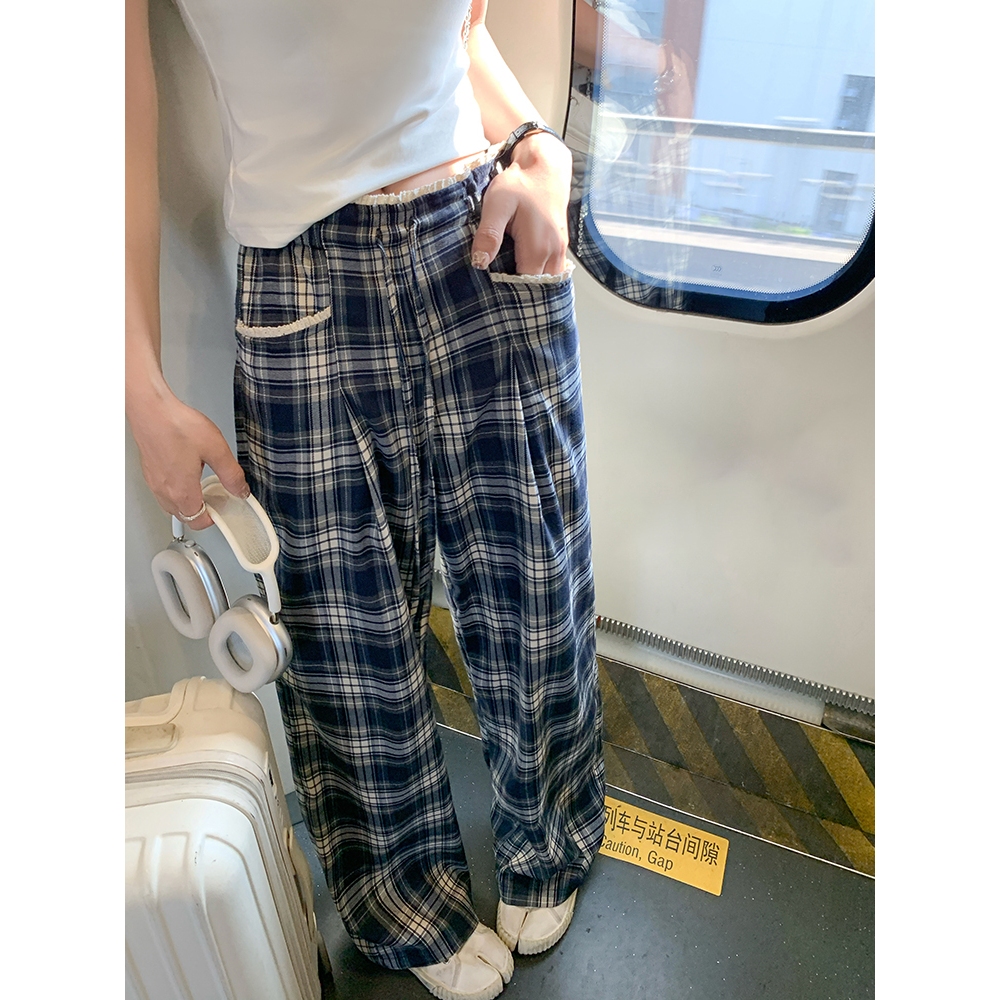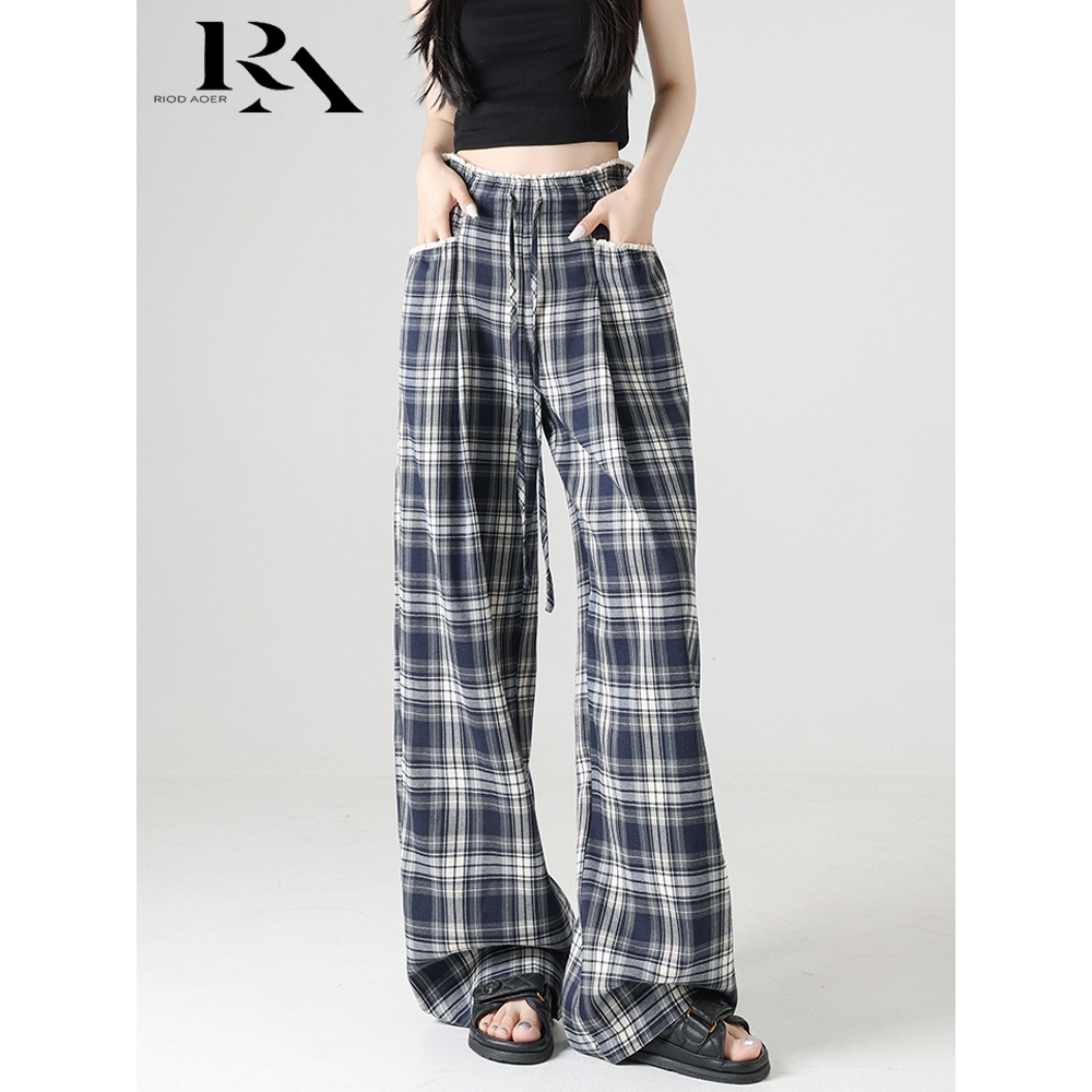 RIOD AOER Celana musim panas tipis pakaian luar kotak-kotak celana kaki lebar musim semi dan musim panas 2025 celana panjang