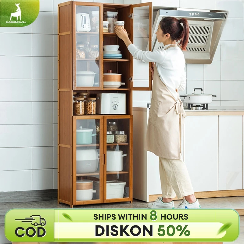 Lemari Dapur Bambu Rak Penyimpanan Dapur Serbaguna Rak Kabinet Dapur Dengan 4 Pintu Transparan