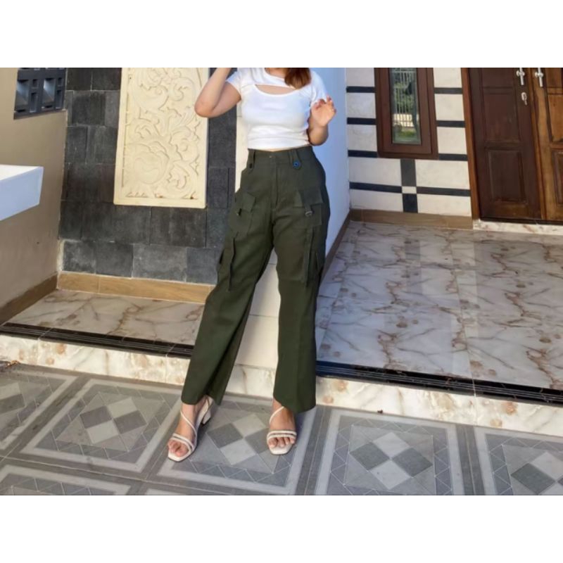 Olivia - Celana Culotte Cargo Strech Katun Twill / Kulot Cargo Wanita Highwaist Kekenian Dengan 4 Saku